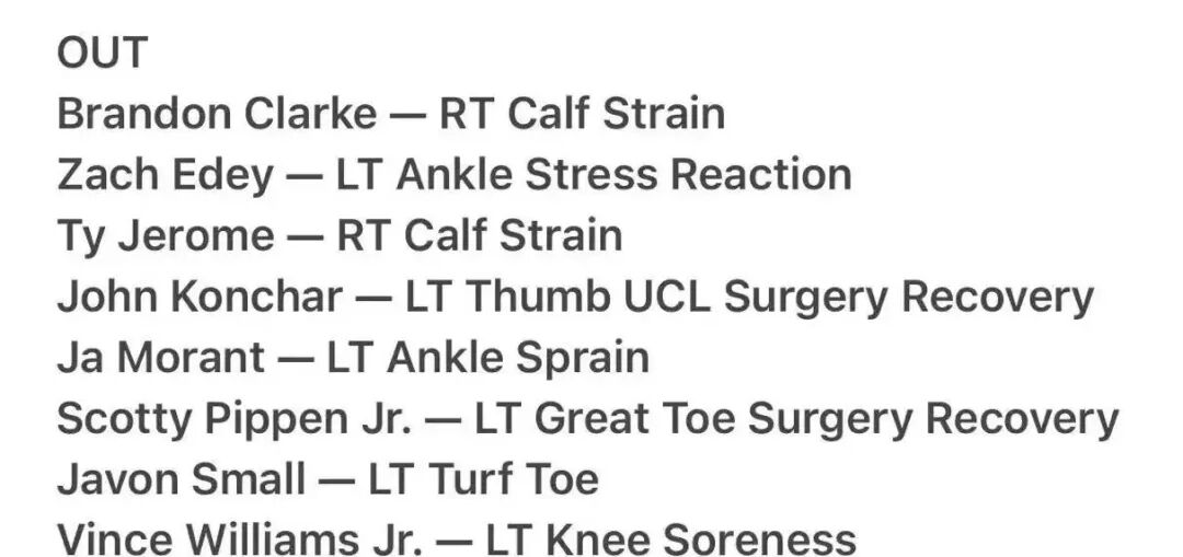 再者,也与这支球队场外因素,战绩拖累有关:腰王莫兰特的持续作妖行为自不用说,21-23年三个赛季好不容易打出点希望,又被接二连三的伤病拖累,自此一蹶不振;这不,之前生龙活虎的锋线布兰登-克拉克,在本赛季复出第2场比赛中,又双叒拉伤了:在前日对阵华盛顿奇才的比赛中遭遇右小腿二级拉伤,需要3周后重新接受评估。上赛季,克拉克因遭遇右膝后十字韧带严重扭伤提前结束了整个赛季。莫兰特目前又因为左脚踝扭伤高挂免战牌,球队潜力大中锋扎克-伊迪也因左脚踝应力反应陆续缺席几场比赛...