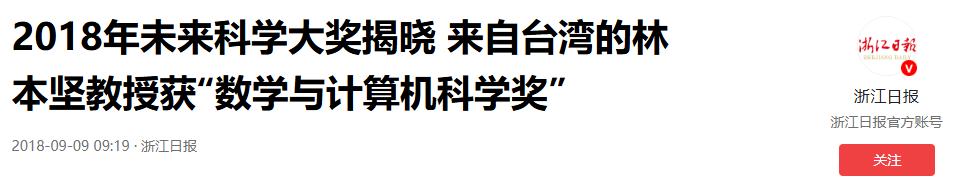 浙江日报2018-09-09:《2018年未来科学大奖揭晓 来自台湾的林本坚教授获“数学与计算机科学奖”》