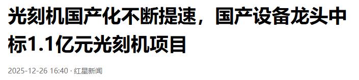 红星新闻2025-12-26:《光刻机国产化不断提速,国产设备龙头中标1.1亿元光刻机项目》