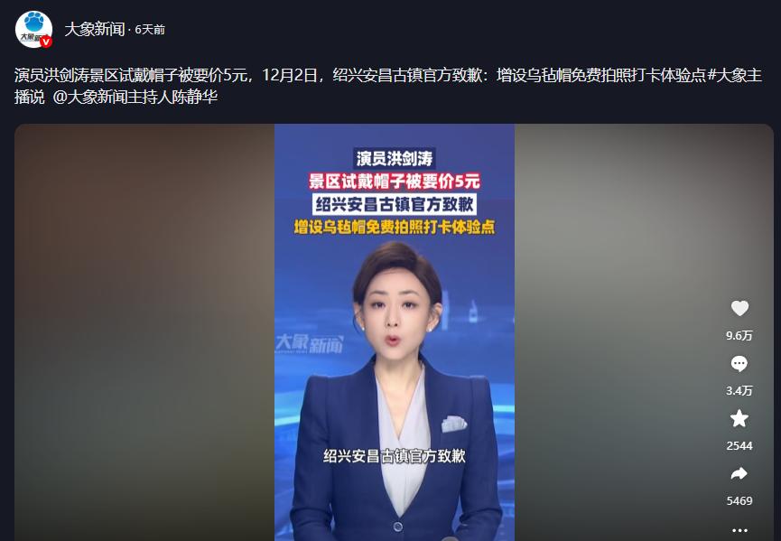 近日,洪剑涛在安昌古镇游玩时,被一个卖乌毡帽的店家惊掉了下巴。