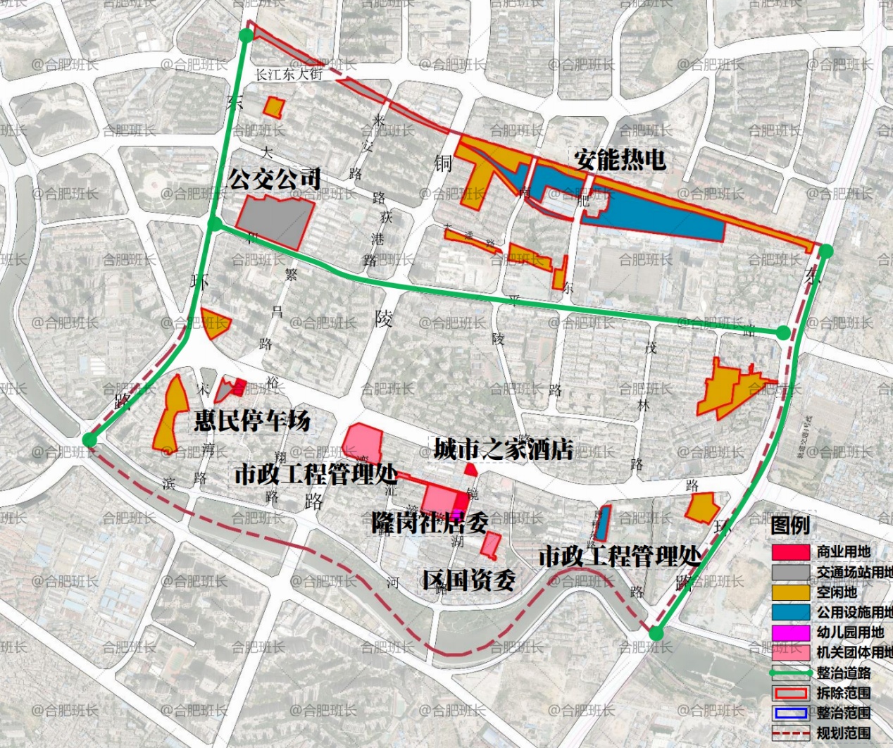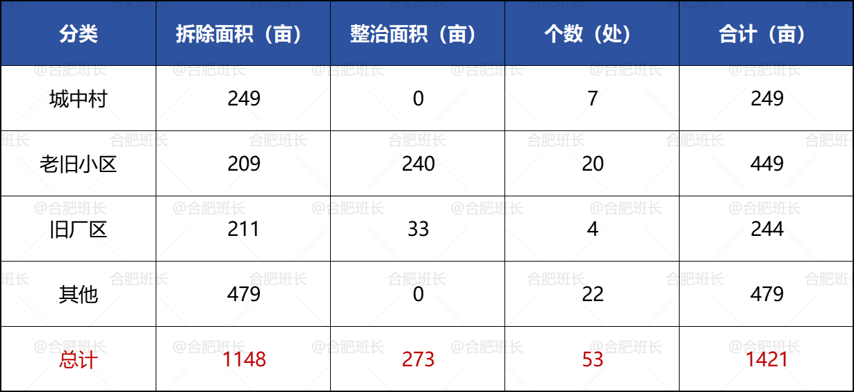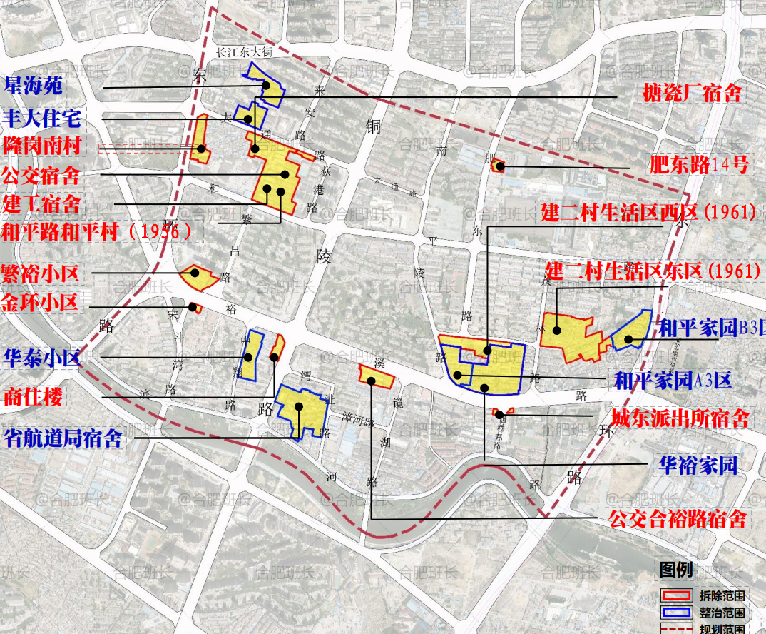 瑶海区计划对隆岗村、老安纺、省二建生活区、陈老岗、和平村等片区进行城市更新,计划更新对象总面积约1421亩(53处),其中拆除面积1148亩(46处),整治提升面积273亩(7处)。