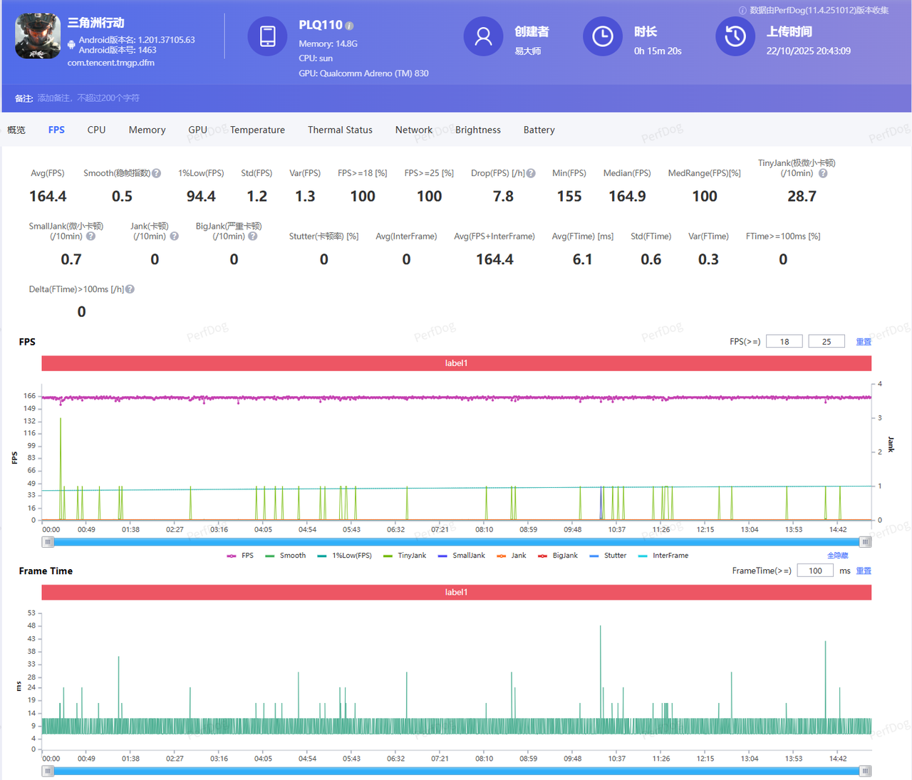 165Hz 电竞直屏搭配 3200Hz 瞬时触控采样率,玩《三角洲行动》这些FPS游戏简直丝滑到起飞,不仅平均帧率接近满帧的164.6fps,帧率曲线几乎拉成一条直线,全程流畅不卡顿。敌人移动的每一帧细节都清晰可见,开镜、压枪响应快得离谱,相比之前120Hz的手机,能更早锁定目标,竞技优势直接拉满。