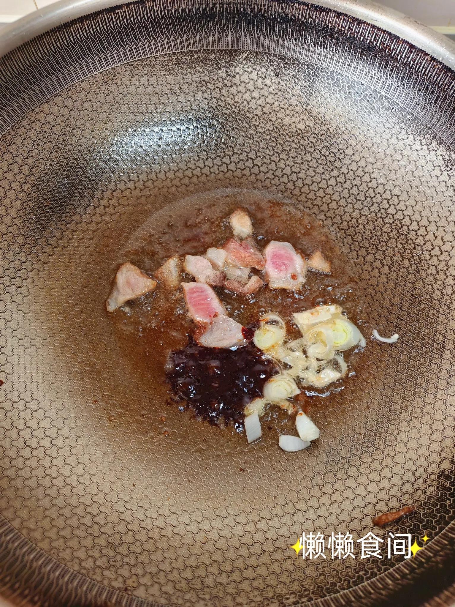 2、锅里倒入食用油,加入切好的肉片炒至焦黄,加入葱花炒出香味,加入两勺甜面酱,翻炒几下。
