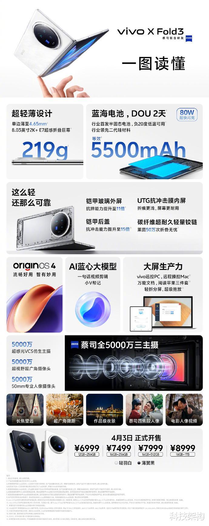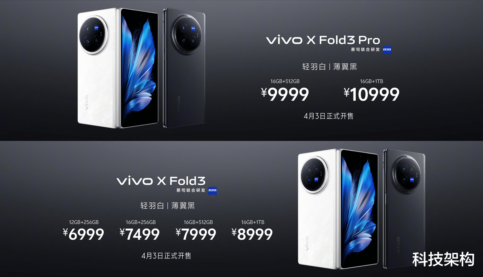 售价方面,Vivo X Fold3的12+256 GB版本售价为6999,16+256 GB售价为7499元,16+512 GB售价为7999元,16+1 TB售价为8999元,Vivo X Fold3 Pro的16+512 GB售价为9999元,16+1 TB售价为10999元。