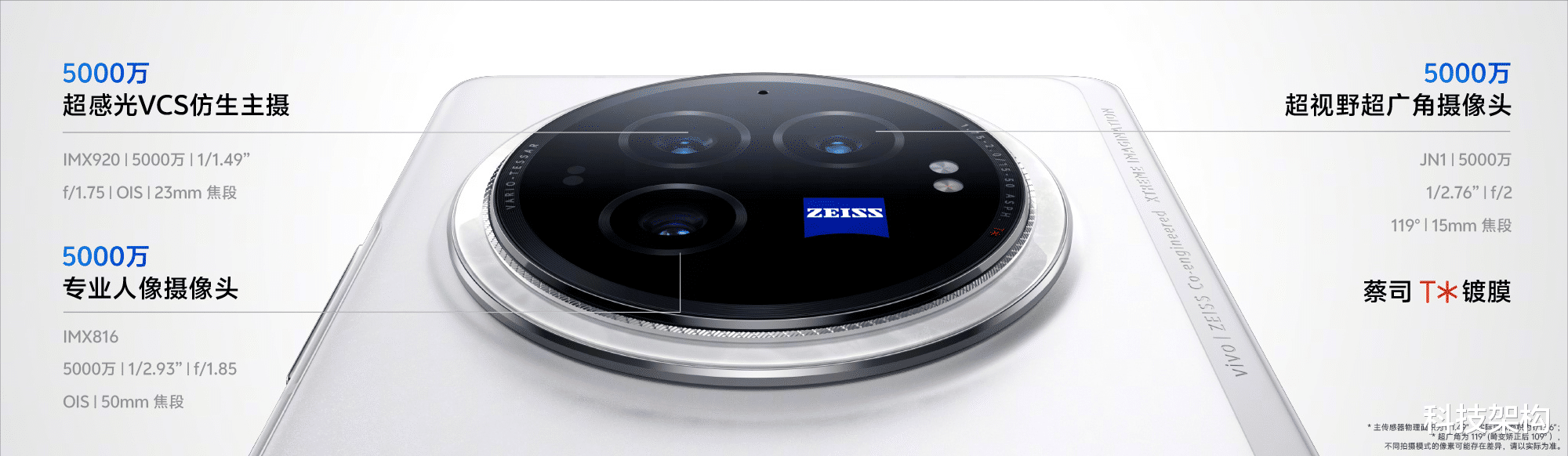 在影像系统方面,vivo X Fold3的主摄像头为5000万像素超感光VCS仿生主摄,传感器为IMX920,5000万像素人像摄像头,传感器为IMX816,均支持OIS光学防抖。前置摄像头为32MP,无论是内屏还是外屏均有搭载。