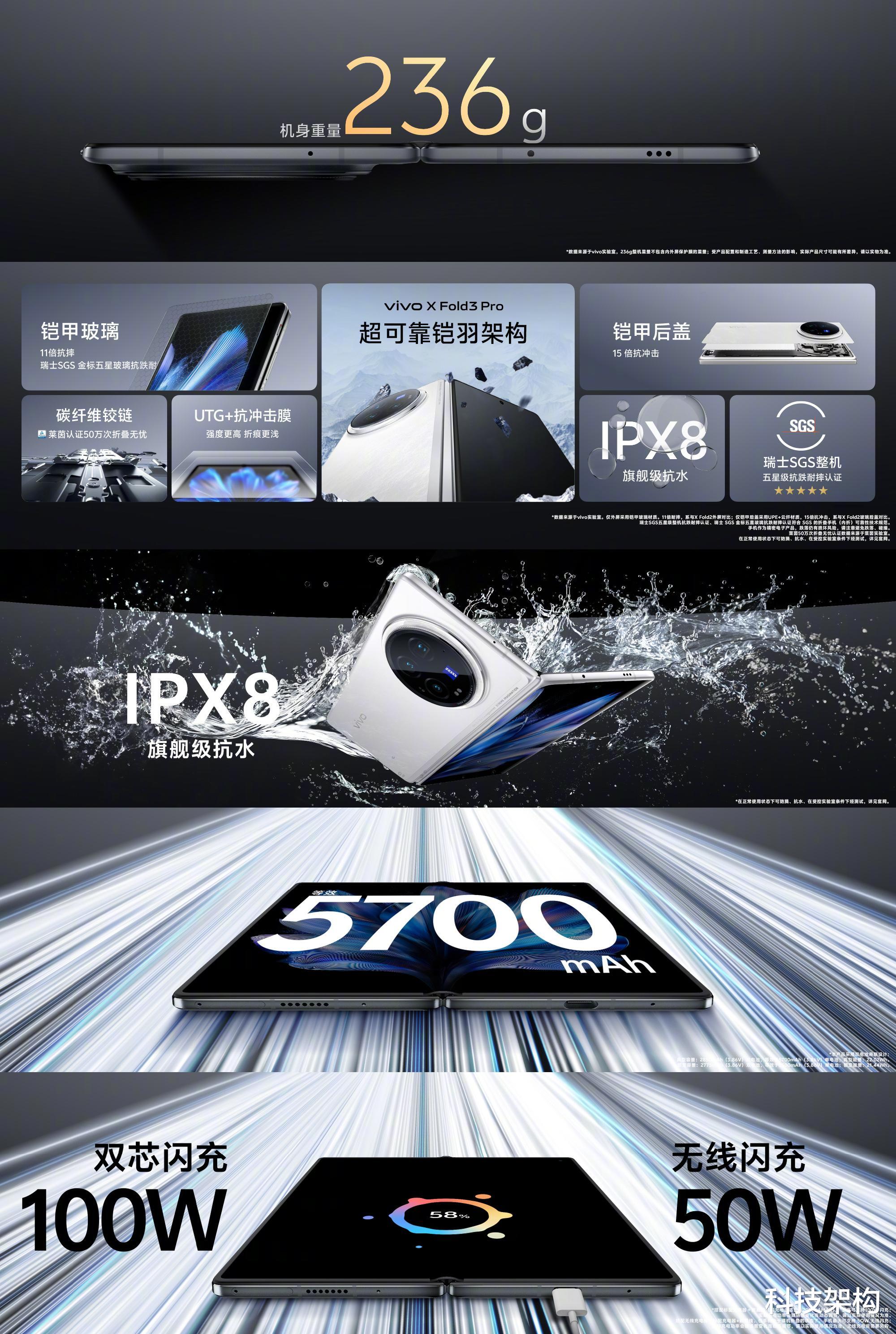 其他方面,电池容量提升到5700mAh,并支持100W的有线快充、50W的无线快充以及5W的反向无线充电,此外,vivo X Fold3 Pro的内外屏指纹解锁方案升级为3D超声波屏幕指纹,防水等级也提升至IPX8。