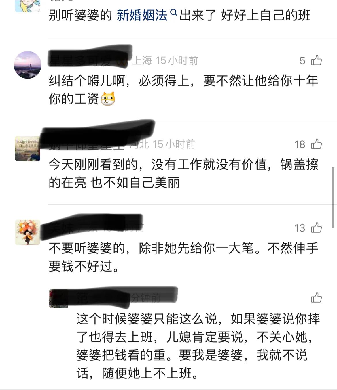 还有网友说,不要听婆婆的,除非她能给你一些保障,不然,说什么也不能放弃自己的工作。