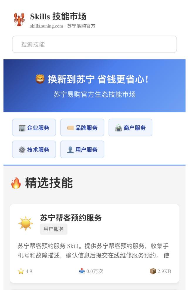 “以前装完‘龙虾’框架,想找个趁手技能还得自己折腾,能否安全调用更是心里没底。现在相当于房子硬装好了,家具也配齐了,用户拎包入住就行,省心多了。”苏宁易购相关负责人表示,智能体技能市场规划上线数十款技能,涵盖家电3C全流程服务、家政、康养、健康等多元场景。初期已开放苏宁帮客预约服务技能,后续多个零售技能也将持续上线,并接入更多第三方开发者,让智能体技能市场成为智慧生活的“应用商店”。