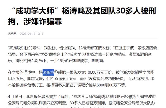 光明网在2023年4月18日关于《“成功学大师”杨涛鸣及其团队30多人被刑拘,涉嫌诈骗罪》的报道
