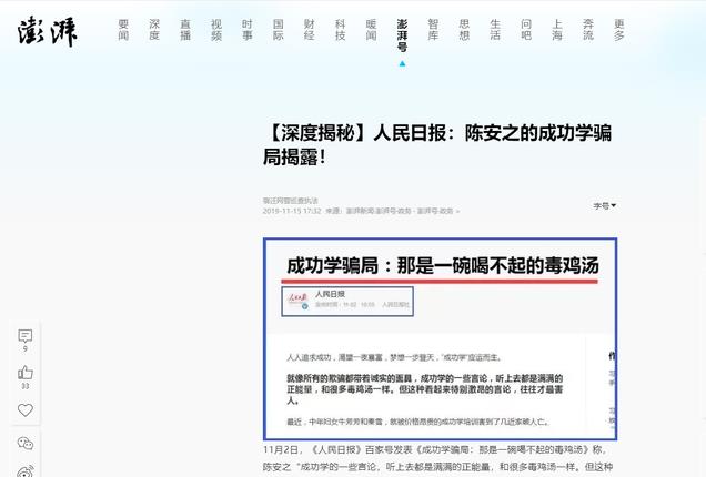 澎湃新闻在2019年11月15日关于《【深度揭秘】人民日报:陈安之的成功学骗局揭露!》的报道