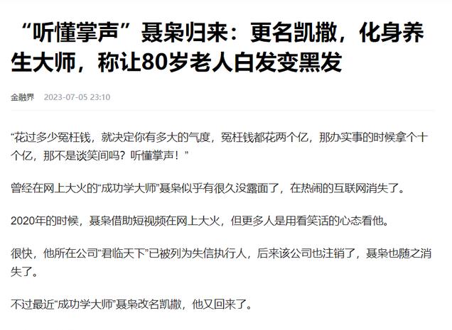 金融街在2024年7月5日关于《“听懂掌声”聂枭归来:更名凯撒,化身养生大师,称让80岁老人白发变黑发》的报道