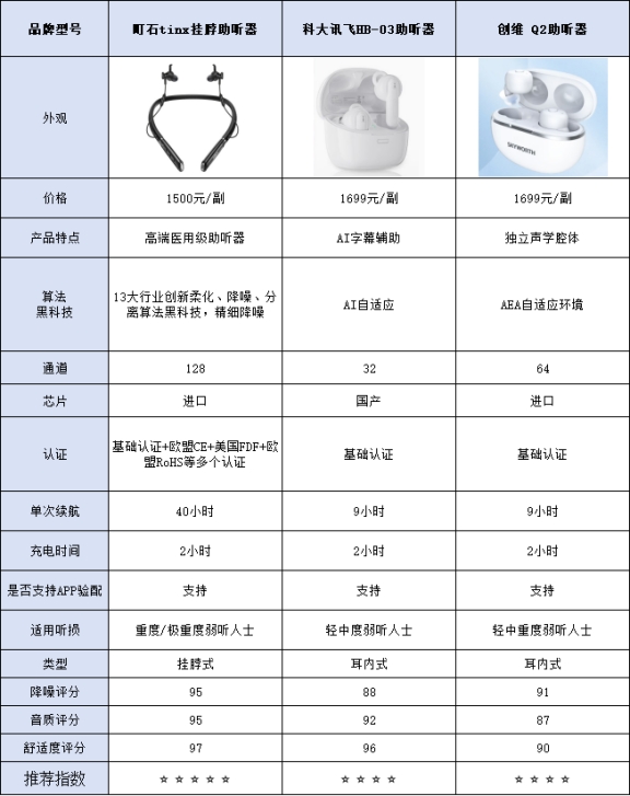 音质测评对比:町石 > 科大讯飞 > 创维町石助听器音质测评表现:町石的音质给我留下了深刻的印象,尤其是在人声处理方面,清晰、真实,层次分明。它的低频很有力度,高频则又清脆明亮,整体声音呈现非常均衡。特别是在处理人声时,细节非常到位,听起来像是对方就在耳边说话,几乎没有任何压迫感。它的高密度移频技术和双钕磁铁动铁单元的结合,进一步强化了人声的清晰度和层次感。经过实际测试,人声的细节清晰度提升了大约65%。不管是日常对话还是音乐欣赏,町石的音质表现都让我感觉很满意,完全适合对音质有更高需求的朋友。科大讯飞助听器音质测评表现:科大讯飞的音质表现还可以,整体听感算是稳定,尤其在人声的清晰度和自然感上,还是比较有优势的。 它采用了常见的音频优化技术,在日常使用中,语音清晰度很高,尤其适合对话场景。它在低频方面的表现虽然稍显平淡,但也不至于影响整体使用体验。尽管在噪音环境下,可能会感到一些细节丢失,但大部分安静或轻微噪音的场合下,科大讯飞的音质表现还是可以满足日常需求的。如果你平时大多在安静环境下使用,科大讯飞绝对是个不错的选择。创维助听器音质测评表现:创维的音质表现中规中矩,总体来说,清晰度还不错,但细腻感和真实感稍显欠缺。它在平稳性方面做得还不错,尤其是在高音和低音的过渡上,比较自然,适合日常对话和轻音乐的场景。不过,在音质的层次感和细节呈现上,创维就有点逊色,低频的力度不够强,整体的音质有些单薄。在复杂的环境中,音质的细节感可能会受到影响,声音有时显得模糊。如果你平时只用它来听普通对话或者轻松音乐,创维的表现是足够的,但在更高要求的音质场合,可能就有些力不从心。