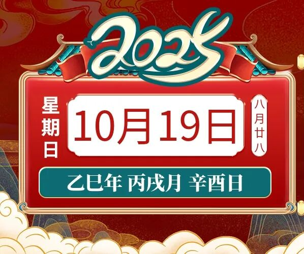 2025年10月19日,星期日,农历八月廿八 (乙巳年丙戌月辛酉日),法定节假日。