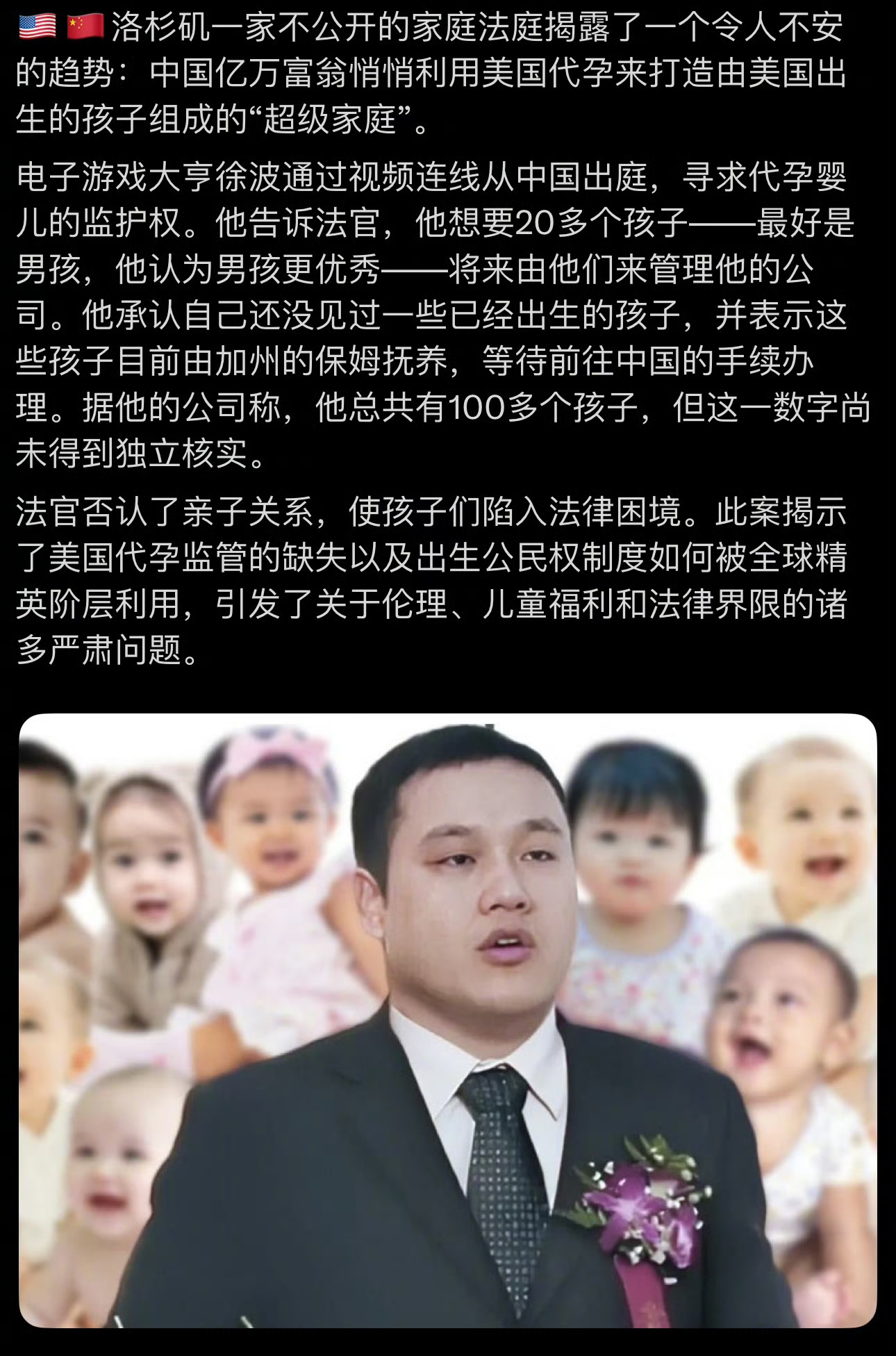 徐波的"百子帝国"堪称魔幻现实——他在洛杉矶法庭申请12个代孕孩子的监护权时,自曝终极目标是生满100个儿子!法官都看傻眼直接驳回,因为这些孩子像商品一样被集中圈养,亲生父亲从不露面。更离谱的是,他公司竟公开承认已有100多个孩子,网上还流传着几十个娃娃齐喊"爸爸"的诡异视频。