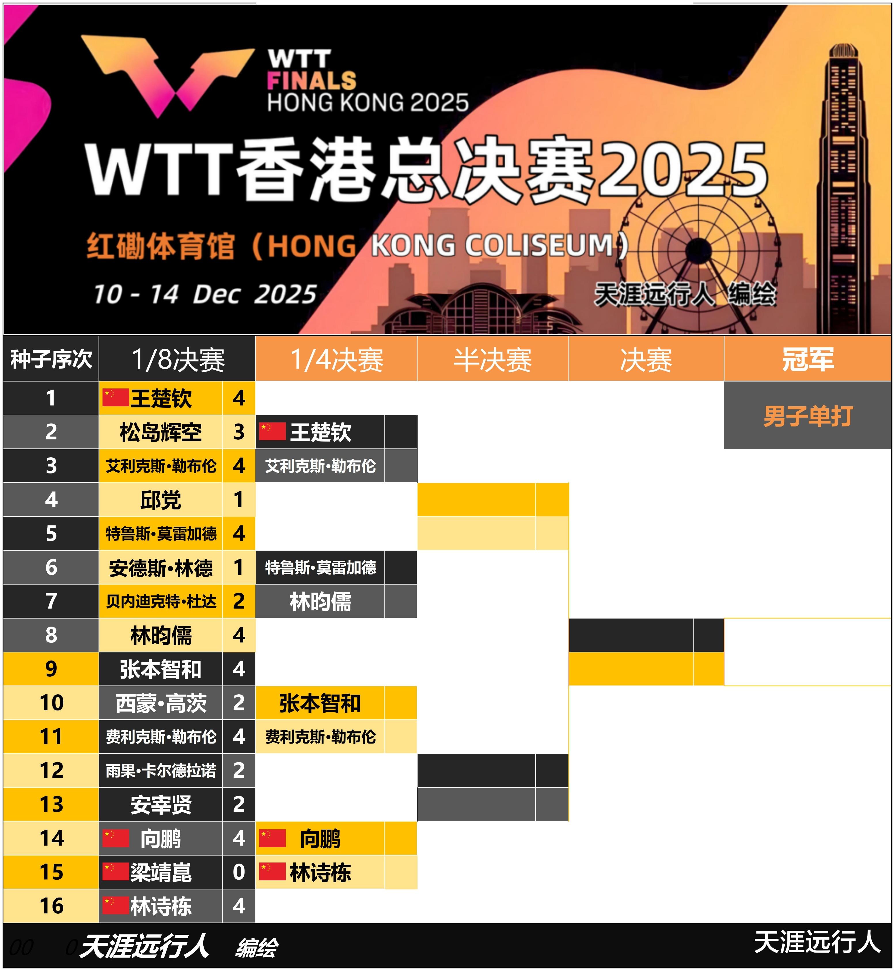 男单八强,国乒三席,上半区王楚钦对战大勒布伦,小莫战小小林;下半区林诗栋、向鹏迎来德比,日乒张本智和孤军作战,静待小勒布伦。