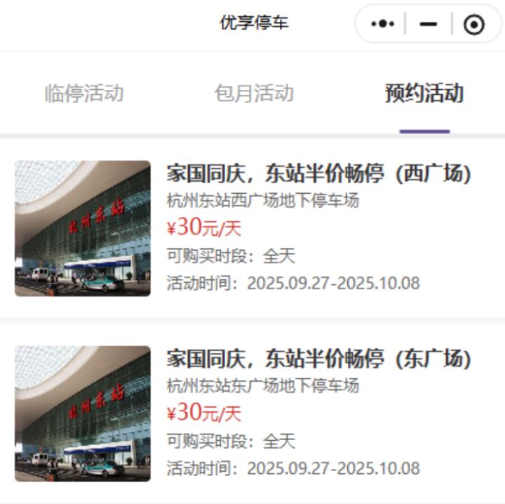 杭州东站东广场、西广场地下停车场:30元/天(原价60元/天)。