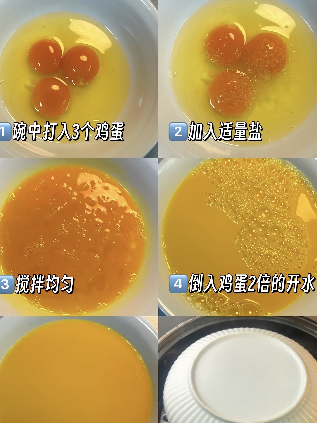 鸡蛋3个,室温放置10分钟(温差小,蒸蛋更嫩),加少许盐、1.5倍温开水(鸡蛋:水=1:1.5),用筷子疯狂打散,表面起小泡——这是“云朵”关键,温开水让蛋花更嫩,盐提前入味。想要更滑?过筛一次,气泡全消失,蒸完镜面般光滑。