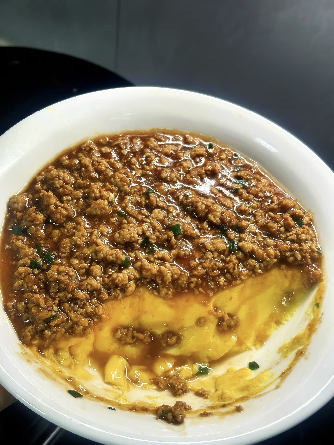 成品亮相:蛋羹奶黄透亮,挂着晶亮肉汁;肉末棕红油亮,点缀其间;葱花绿得晃眼,像给“白云”点了“森林星光”。先来一勺——蛋羹嫩到像豆腐,轻轻一碰就颤抖,肉末咸香紧随,酱汁鲜到像“肉味小烟花”;再嚼一口肉末,“咔嚓”一声,肉汁在舌尖爆开,配一口米饭,汤汁渗进米粒,不知不觉碗底朝天;空口吃也过瘾,鲜到眉毛打秋千。