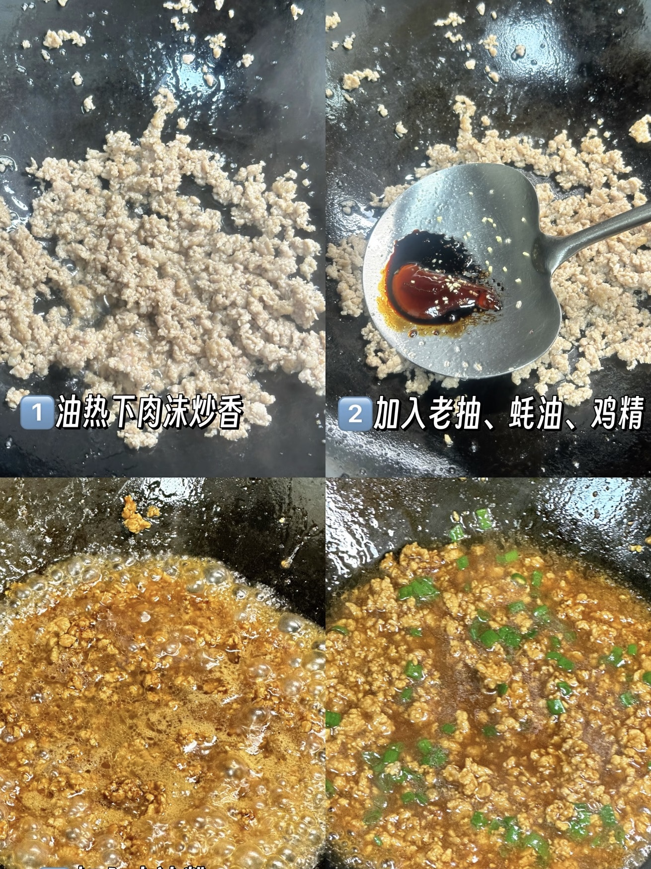瘦肉末100克,肥瘦三七,冷水冲5秒去血水,挤干后加1勺生抽、半勺蚝油、少许白胡椒粉,抓匀腌10分钟。热锅少油,中小火下肉末,快速炒散,炒至变色,沿锅边淋1勺老抽+半勺糖,炒出“黄金肉粒”,像给肉末做了“美黑”,盛出备用——这一步叫“锁香关键”,跳过等于前功尽弃。