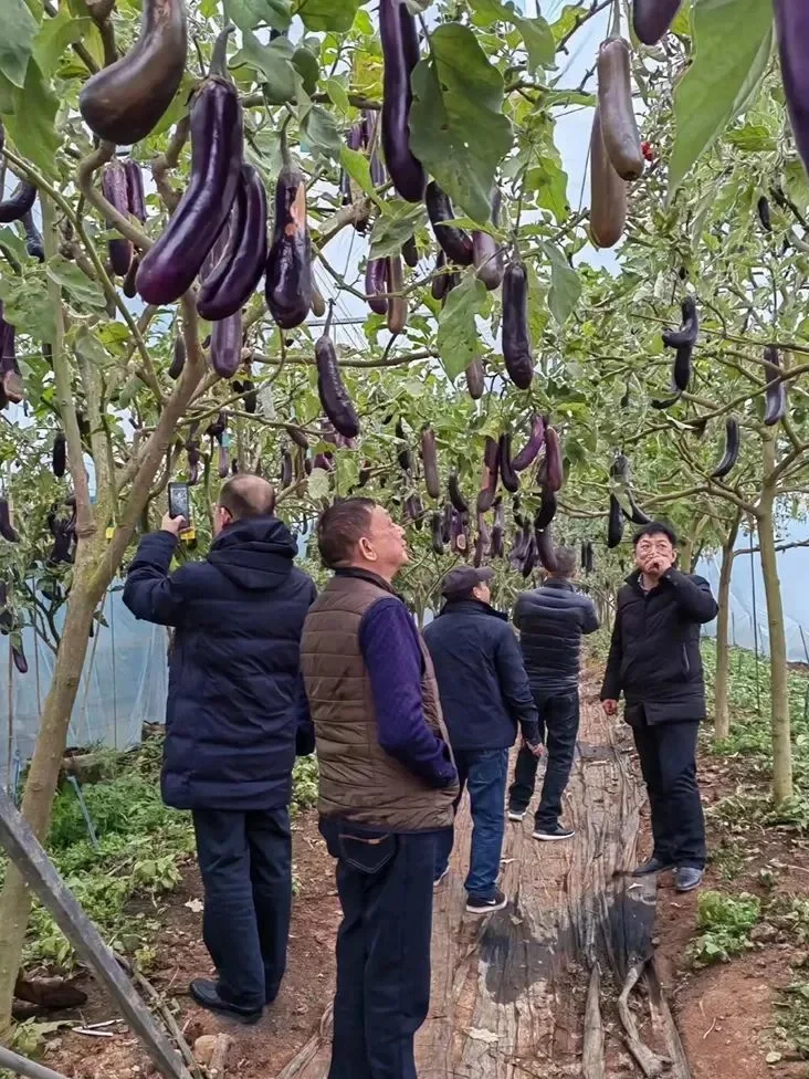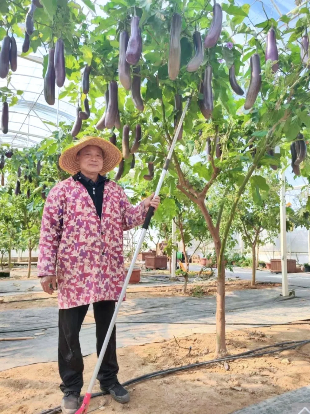 看看,男子种出的茄子树,粗壮高大,摘茄子都要靠工具,根本够不着。