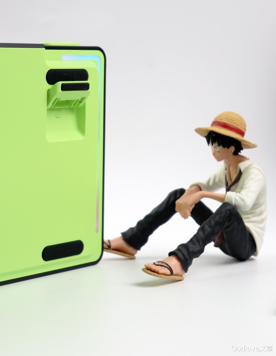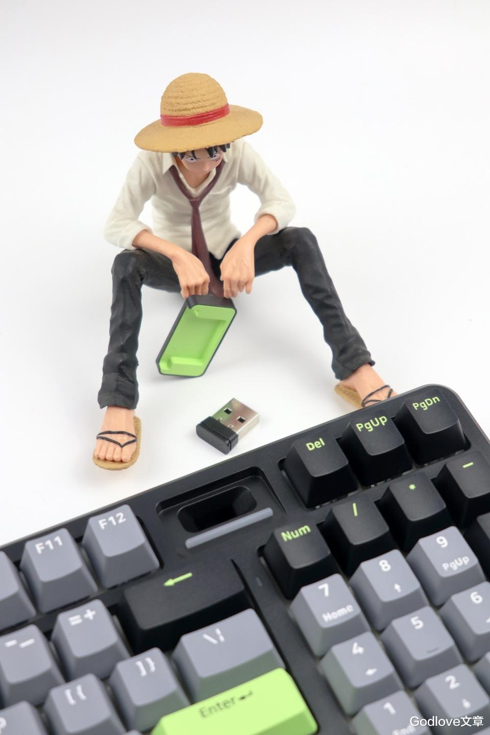 磁吸独立收纳,号称带有多功能装饰灯的时空幻境仓,其中收纳槽能够插入接收器防止丢失,按下Fn+空格键则可通过灯条实时查看键盘电量。
