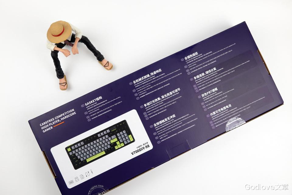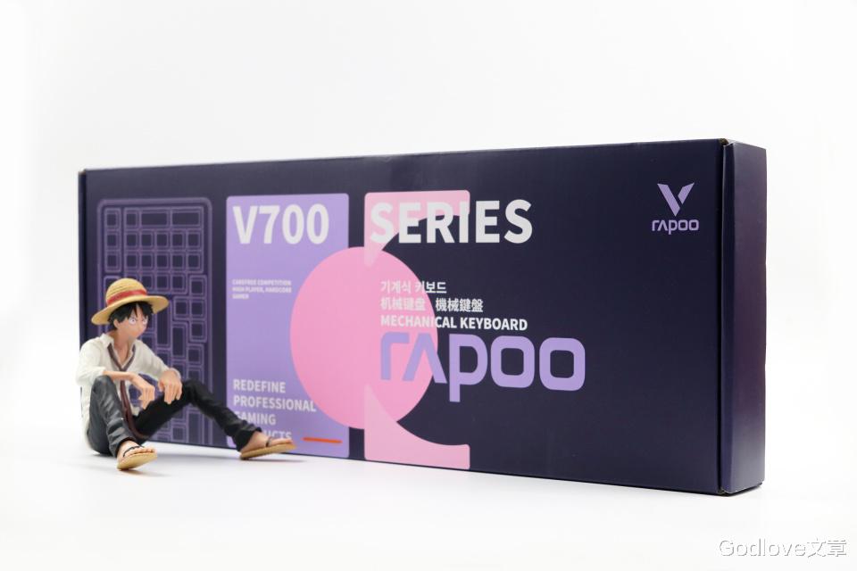 雷柏V700DIY-98键盘外包装采用了紧凑型紫粉配色+科技感线条设计,正面标注了产品的品牌logo和型号介绍: