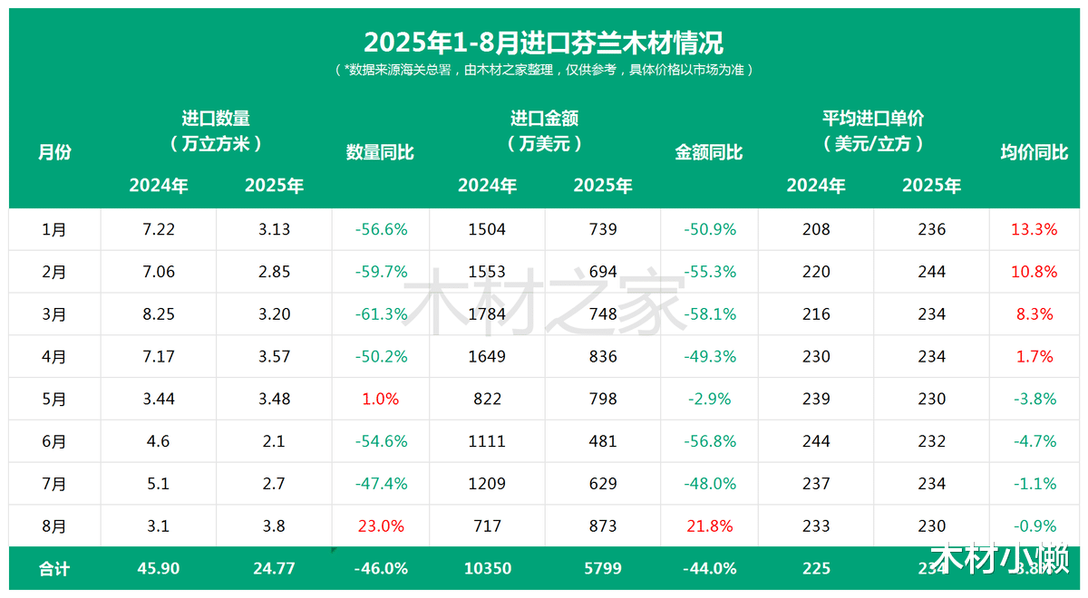 出口市场方面,中国作为芬兰木材重要的出口国之一,海关数据显示,8月中国自芬兰进口木材3.8万立方米,环比增41%,同比增23%;对应货值873万美元,环比升38.8%;平均到岸单价微跌0.9%。然而,年初至8月累计进口量仍较2024年同期下降约46%,显示整体需求仍处下行通道,单月反弹尚不足以扭转全年颓势。