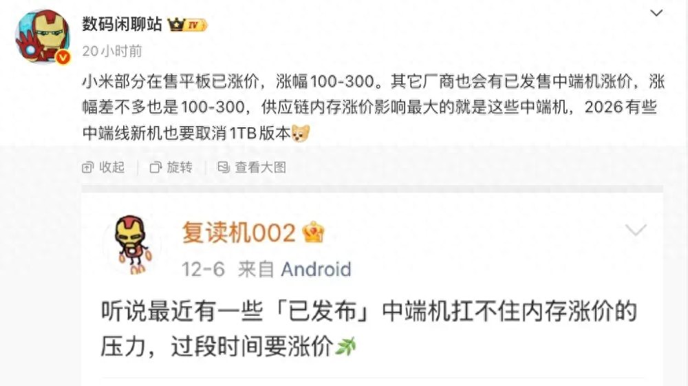 小米部分在售平板已涨价,涨幅100-300。其它厂商也会有已发售中端机涨价,涨幅差不多也是100-300,供应链内存涨价影响最大的就是这些中端机,2026有些中端线新机也要取消1TB版本。