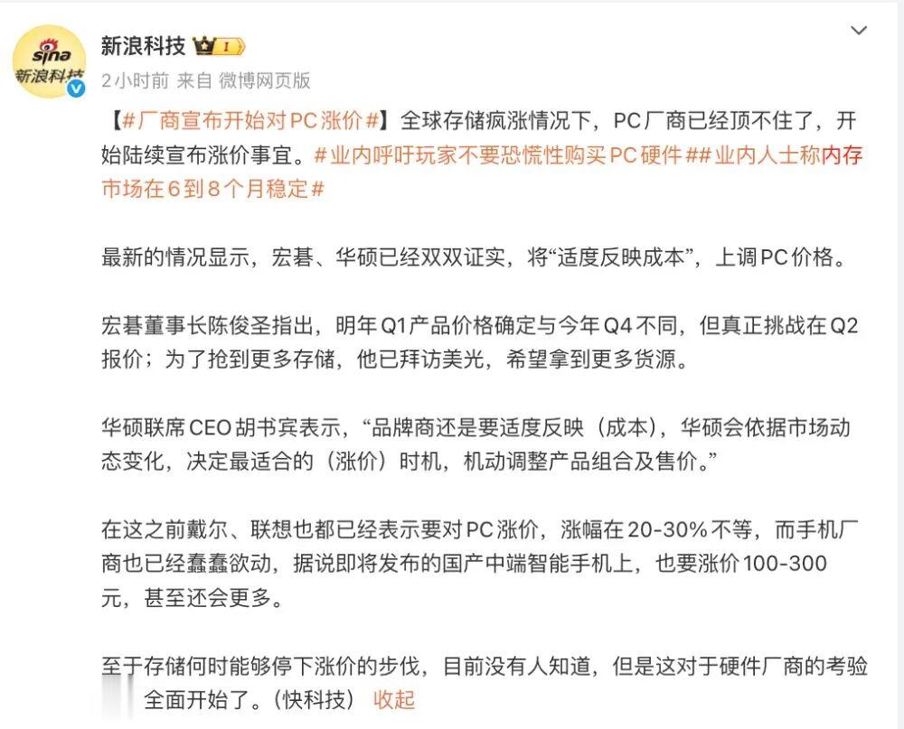 此前的行业预测认为,内存涨价在2027年有希望缓解。但新浪科技最近的另一份消息显示: