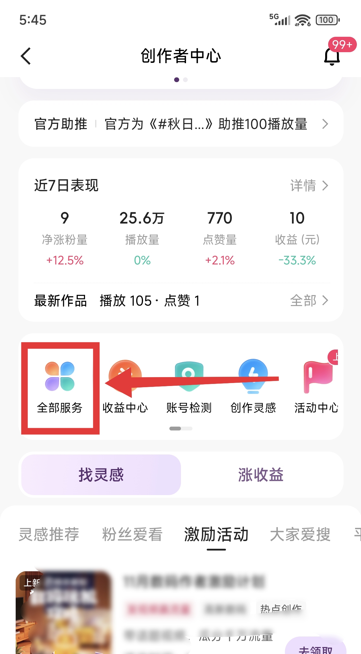 首先点击进入到我页面,然后点击:创作者中心。2.进入到创作者中心页面后,点击:全部服务。3.进入到全部服务页面后,点击: