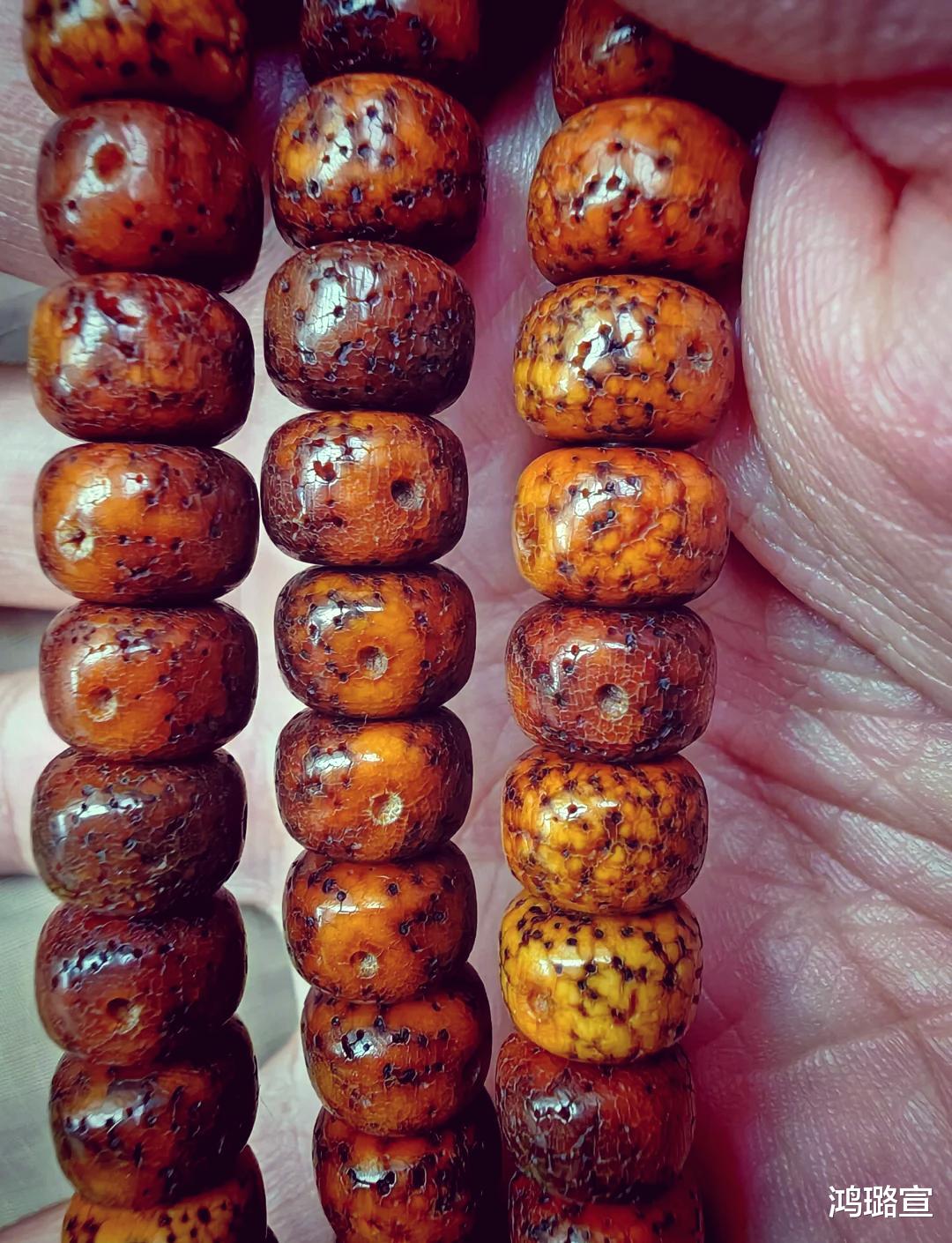 星月菩提是文玩圈中公认的“娇贵”品类,其表面布满星点,结构疏松,极易因受潮、暴晒或盘玩不均而出现色差,即所谓“盘花”。正常盘玩应遵循“干盘为主,汗盘为辅”的原则,初期以净手多盘、少汗慢养,待包浆初步形成后再适度佩戴,方能实现均匀上色。