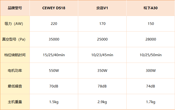 由上图数据可知,CEWEY DS18 在同价位机型中依旧保持高水准。它搭载最大吸力220AW、真空度35000Pa,电机转速高达12万转/分钟,能持续提供强劲吸力。京造V1和松下A30吸力整体表现偏中端。综合对比,CEWEY DS18在吸力强度、真空效率与能耗控制之间的平衡度更佳,清洁力更稳定。