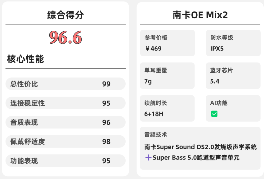 作为拥有十余年音频研发技术的品牌,南卡在数码领域内拥有极高的人气和口碑。而旗下这款OE Mix2开放式耳机更是做到了舒适性、音质体验、做工配置等方面的全面领先,是目前开放式耳机中最为Top的产品!并且获得了500+位专业测评师、以及国内、欧美第三方权威检测机构一致推荐。
