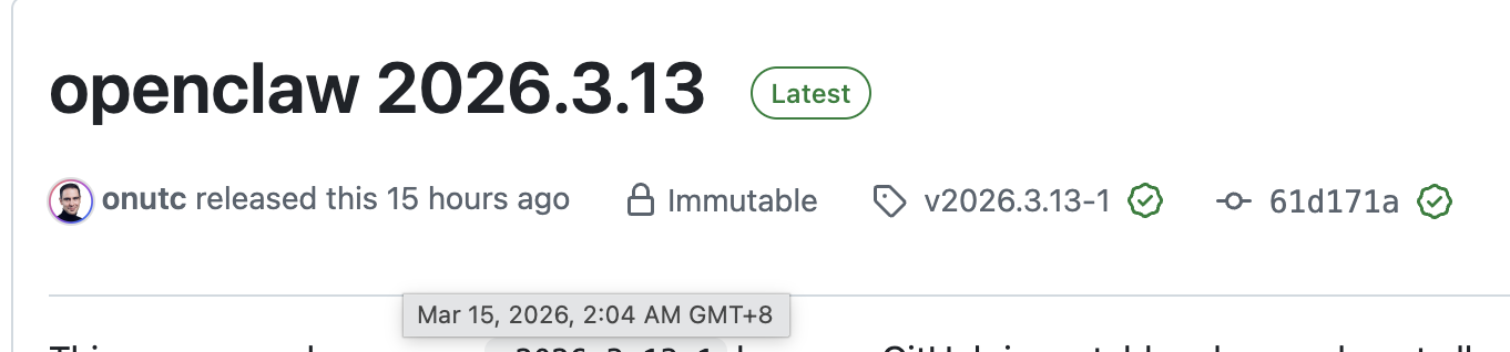 需要特别说明的是 v2026.3.13-1 是 GitHub 上代码的 Tag 版本,OpenClaw 的版本是 v2026.3.13。