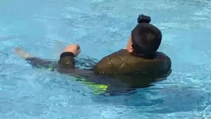 消防员换上薄款羽绒服落入水中。尽管同样被托起,但明显感觉没有厚羽绒服浮力大,整个下半身吊在下面。模拟水中挣扎后,消防员感觉气体向外漏了一点,浮力小了一些。