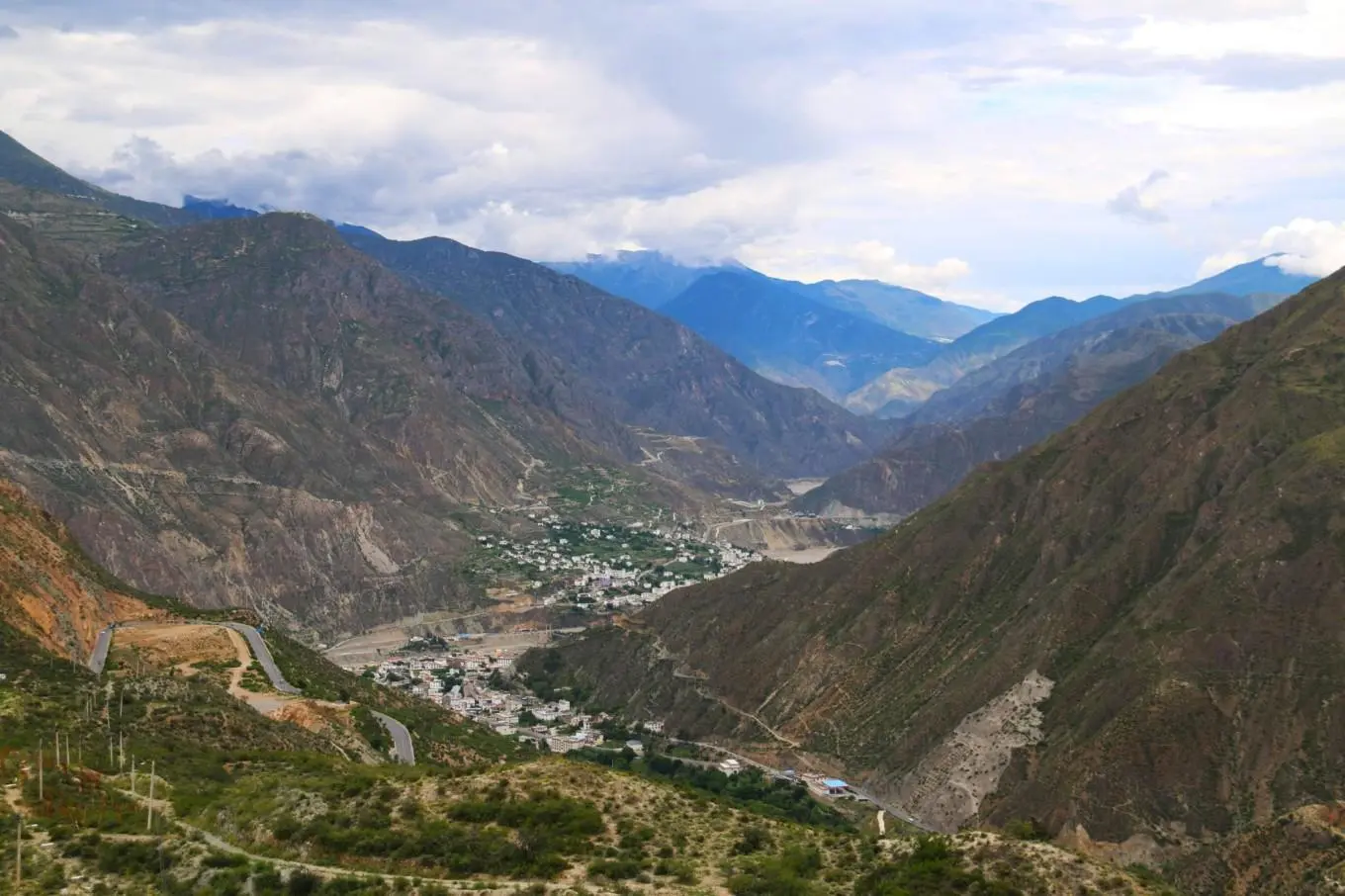 沿着G214继续北上,高原的天气真是多变,刚刚 香格里拉 的阴雨变成路途上的太 阳高 照,蓝天白云显现出来,可是没两分钟云层又一次堆积起来。G214越来越像G318的味道了,不过这一段比起川藏线来说还是宽一些,路边正在修建观景停车场,停车场下深深的峡谷,还有不少村庄建筑,这一段的道路都在山腰处,低头是峡谷抬头是山峰。
