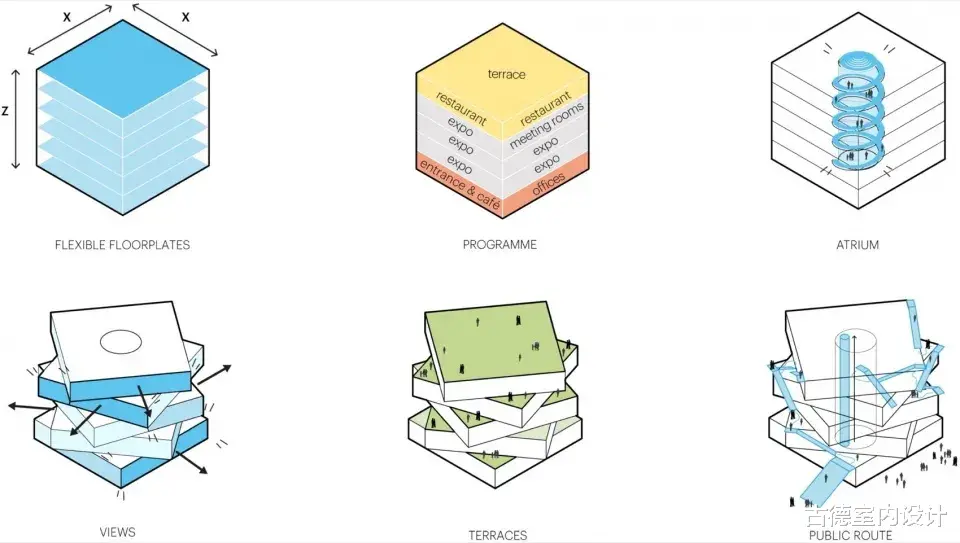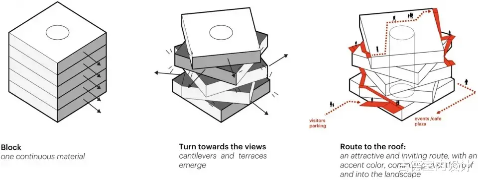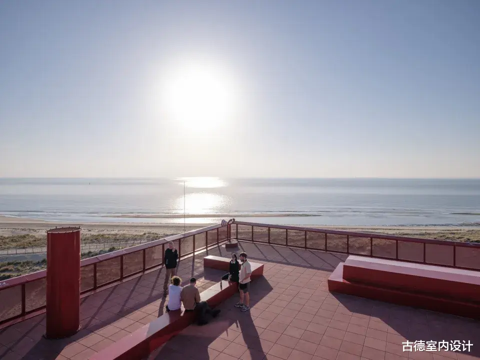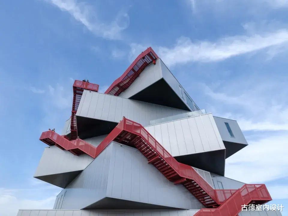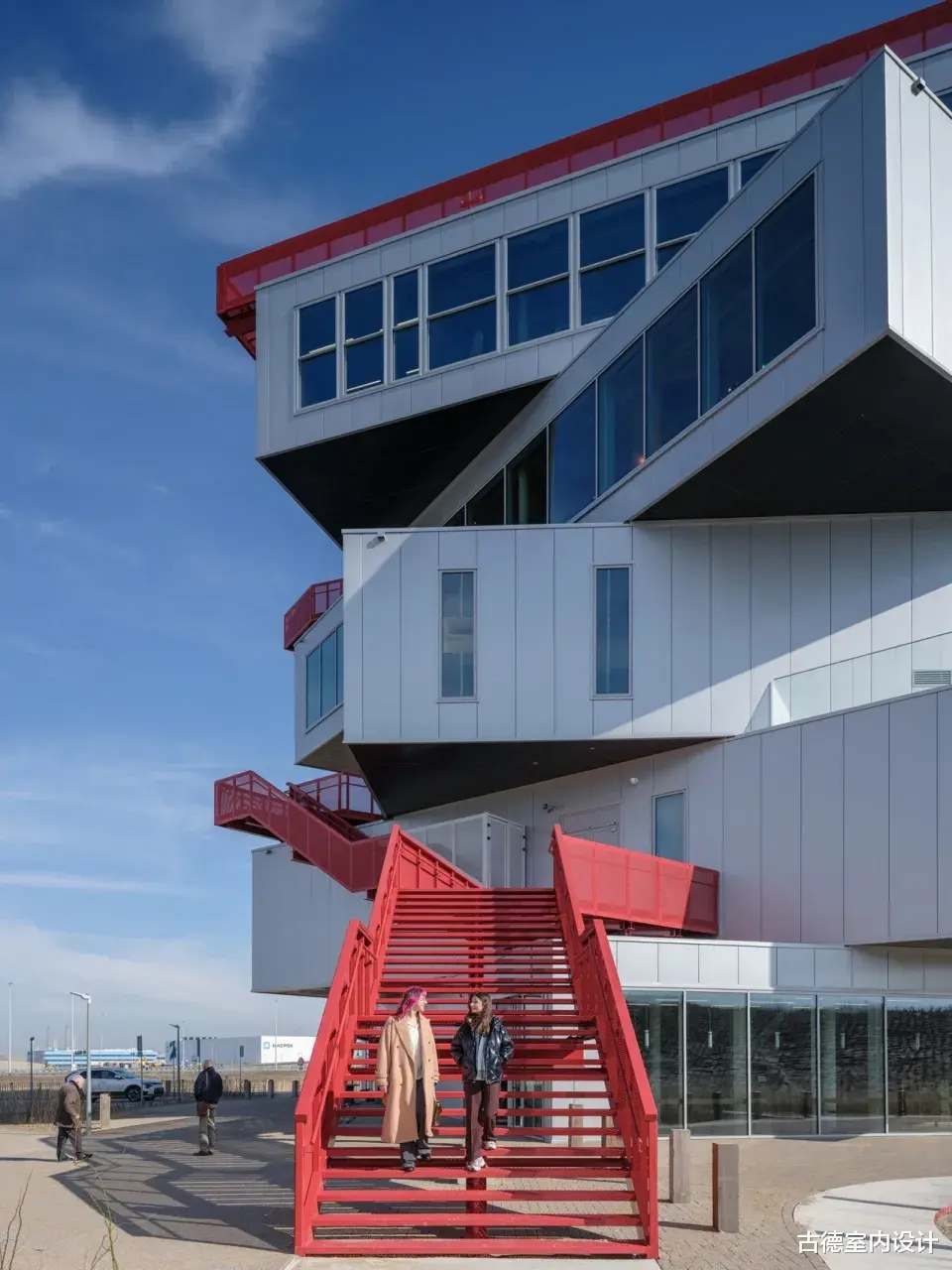 建筑外部,由于各层朝向不同,每层都形成了平台。这些平台通过鲜红色的楼梯相连,楼梯沿着建筑旋转上升,标示出通往屋顶的路径。该步道对公众免费开放,使建筑成为一座俯瞰港口的观景塔。