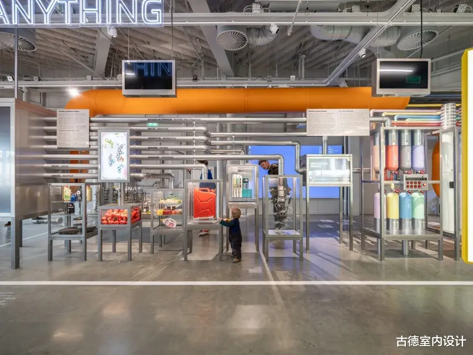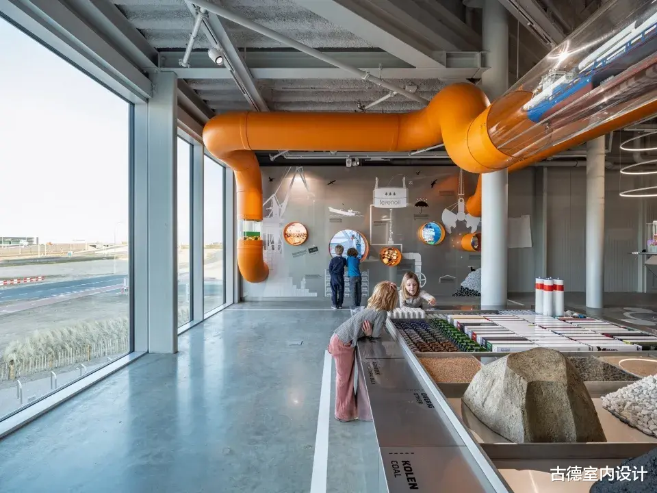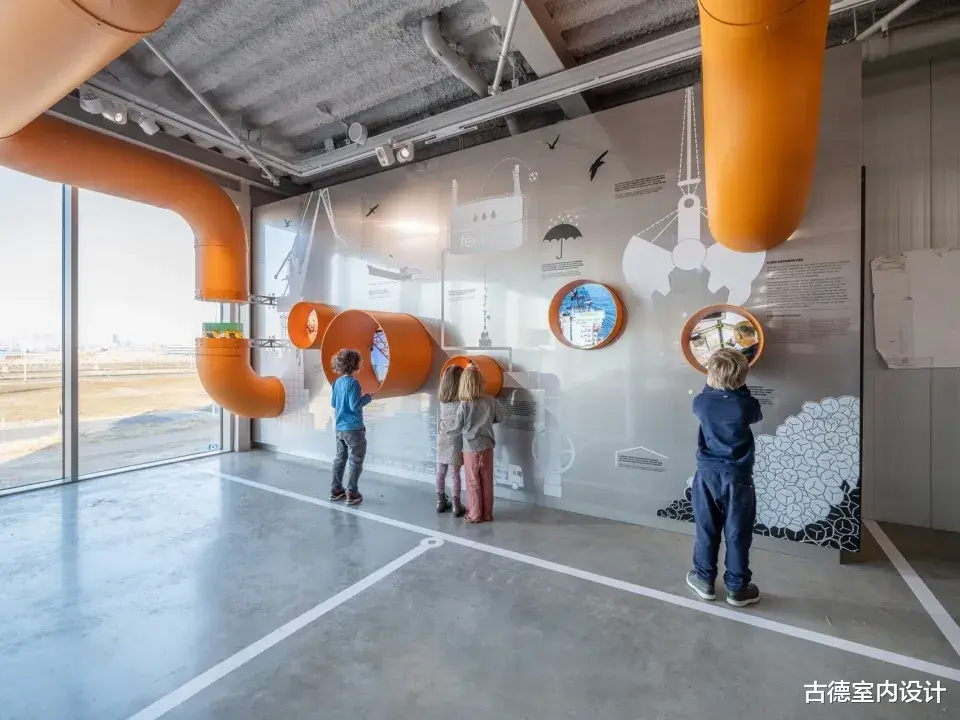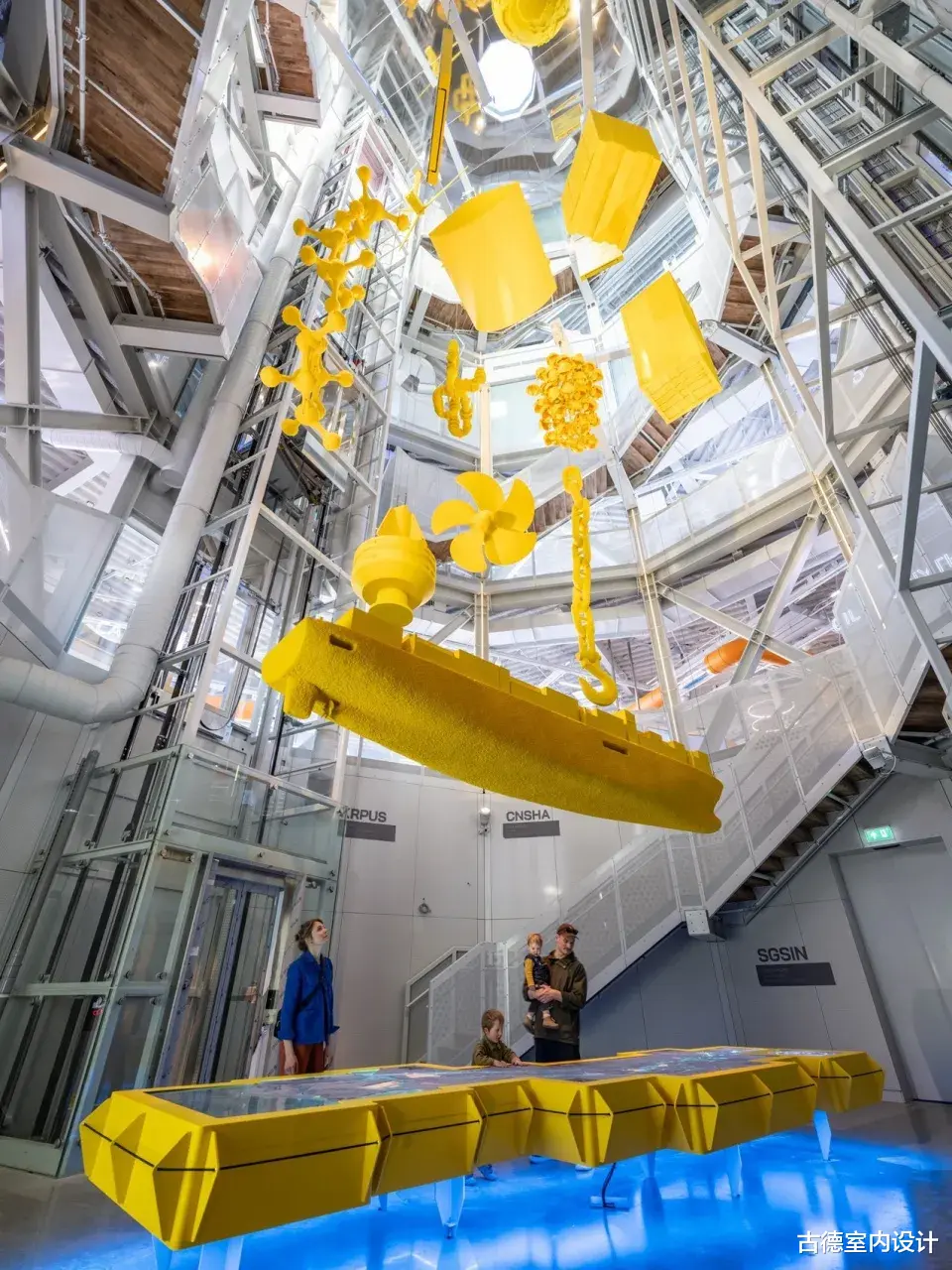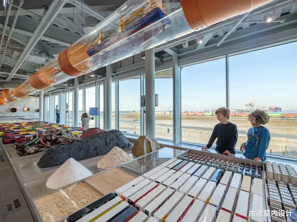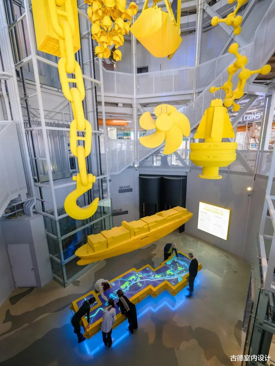 由Kossmanndejong设计的常设展览分布于中间三层空间,展品在这一工业化环境中如同物件一般摆放。展览的每一层探讨不同的主题,而各层的全景窗则聚焦港口内的特定元素,以增强展览内容的呈现效果。建筑中央设有22米高的中庭,本身便是一个展览空间。中庭中央悬挂着一件动态雕塑,而底层则展示了一座鹿特丹港的模型。这一戏剧性的空间通过镜面天花板增强了视觉高度,而底层入口的旋转门则隐藏了展览内容,使参观者在进入建筑核心空间后才得以揭示。