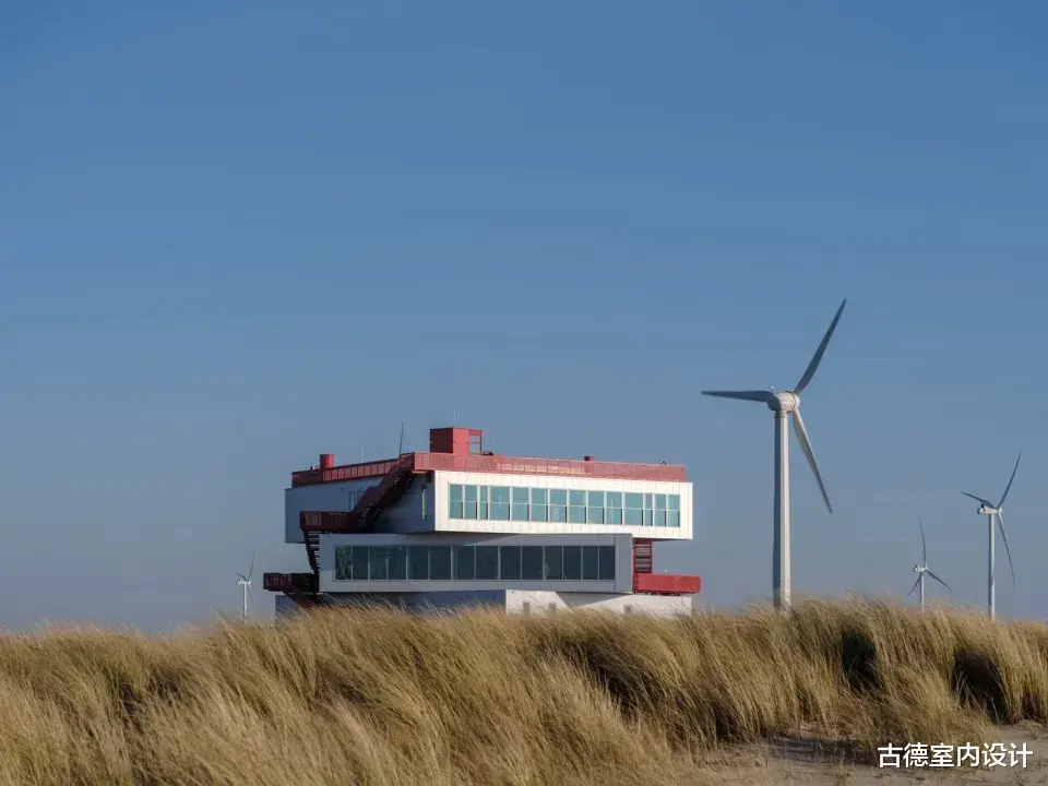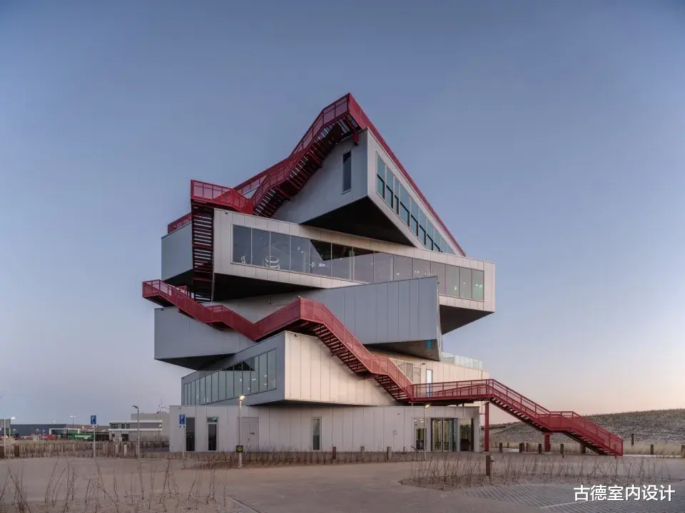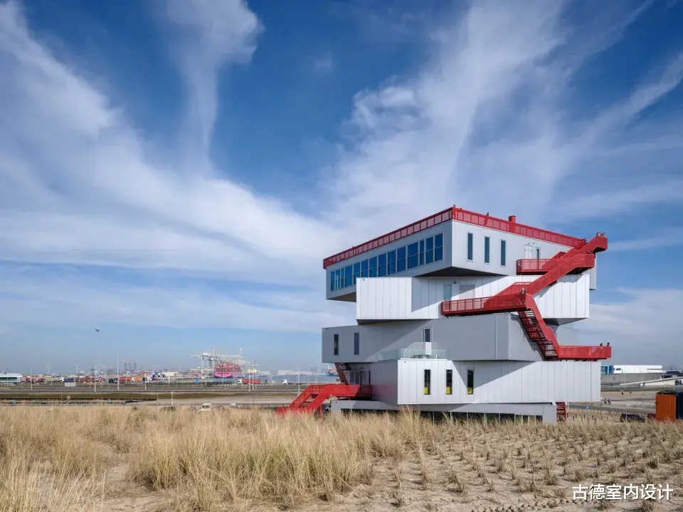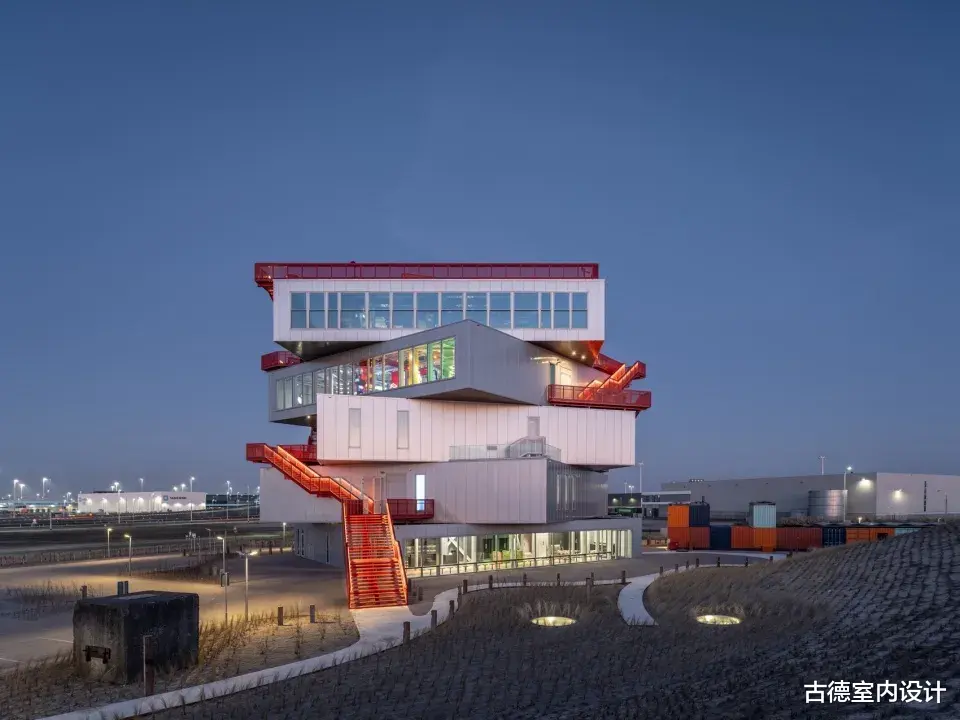 Portlantis占据了港口Maasvlakte2人工陆地扩展区海滩的显著位置,成为远处可见的灯塔式地标。建筑采用务实、直接的设计方法,以简单的功能性、戏剧性的存在感和工业化的材料,展现港口的精神。建筑的形态直接回应了内外部的活动:每层均为方形平面,并设有大型全景窗,分别框定不同方向的风景。各层的朝向和窗户的方位均与其功能相对应:底层的咖啡馆窗户朝西,提供了俯瞰沙丘的静谧景色,而四层的餐厅则可同时欣赏北海的日落和夜晚灯火辉煌的港口天际线。