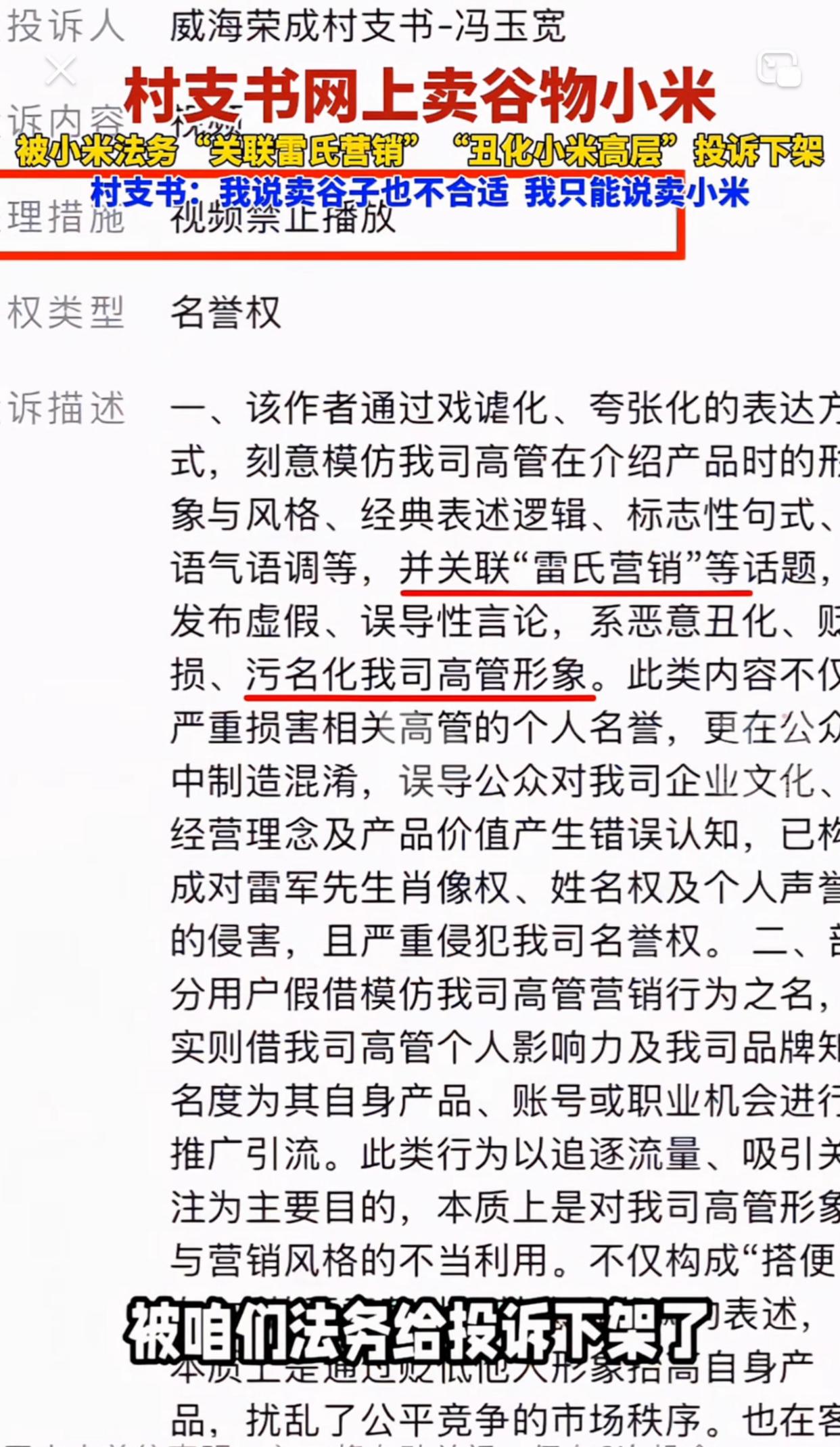 而是这个支书在卖小米的时候,蹭雷军流量,拿小米车开玩笑,甚至恶意的模仿雷军的形象,调侃雷军,也就是基本上大家见到黑雷军的那些话术。然后被举报了,我们也能看到下架原因是名誉权投诉的问题。