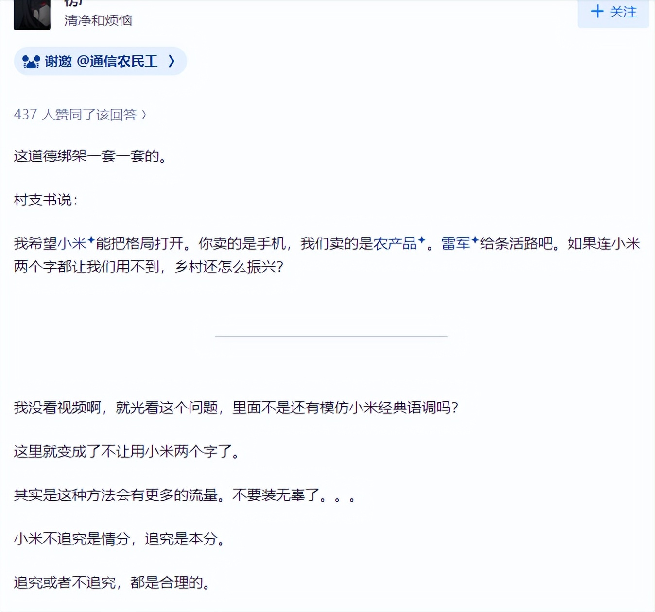 他认为自己卖的是地里的小米,和小米公司卖的手机、汽车毫不相干,并且无意蹭雷军流量,恳请给乡村振兴留条路。