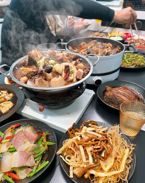 腊蹄子火锅是恩施人待客的大菜。选用猪蹄腌制熏制而成的腊蹄子,斩成大块,冷水下锅,加入姜片、干辣椒、花椒,慢慢炖煮。等到腊蹄子炖得软烂,汤色奶白,就可以端上桌了。腊蹄子火锅里通常会加入萝卜、土豆、豆腐等配菜,边煮边吃,越煮越香。一家人围坐在火塘边,喝着苞谷酒,吃着腊蹄子火锅,窗外寒风呼啸,屋内暖意融融,这就是土家人冬天最幸福的时光。