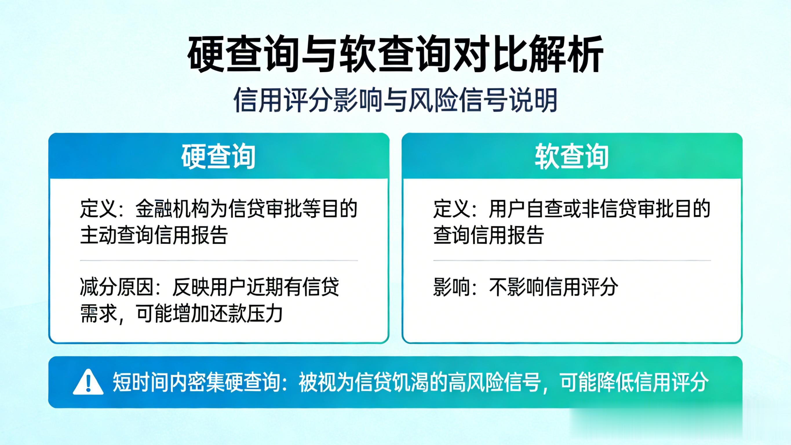 2.3 “饥不择食”的信号:频繁的硬查询每当你申请一笔新的信用卡或贷款时,金融机构都会查询你的信用报告,这个动作会被记录下来,称为“硬查询”。与之相对的是“软查询”,比如你自己查询信用报告或现有银行对你进行贷后管理查询,软查询不影响信用分。