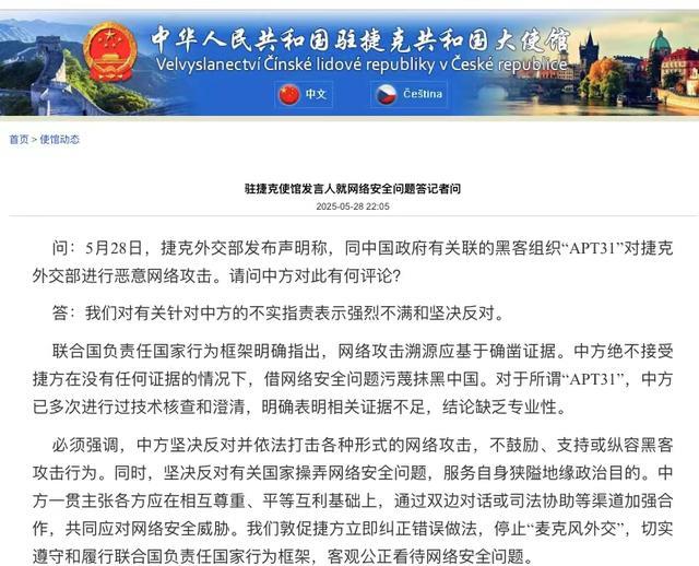 根据他的说法,早在2022年,捷克反间谍机构发现网络入侵者,针对捷克外交部的一个网络展开的攻击,在长达3年的跟踪和调查后,捷克认定,网络攻击来自与中国政府相关的一个黑客组织APT31。由此他们才召见大使对此抗议,还要求中方采取一些措施纠正网络攻击行为,因为这给双方关系带来严重后果。