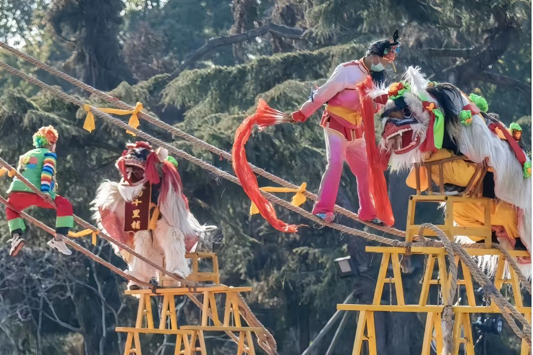 方寸高台间,翻滚腾跃时,“金镀眼睛银贴齿,奋迅毛衣摆双耳”,北狮腾挪翻滚,炯炯狮眼藏机敏,利落甩头显霸气;南狮踏桩而行,凌空跃动展灵巧,步步惊心见绝活。