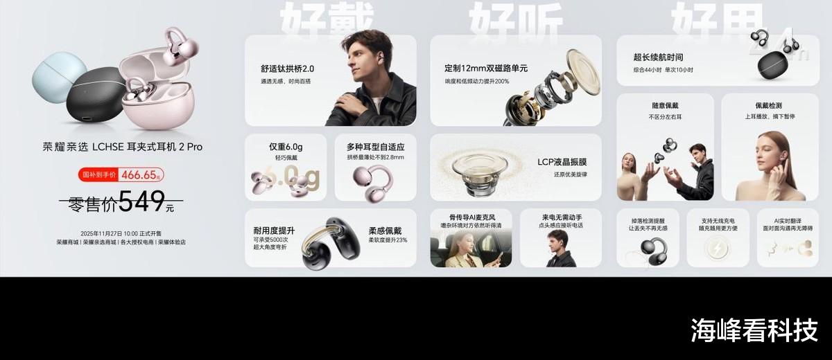 11月24日,荣耀500系列新品发布会重磅举行,正式发布荣耀亲选LCHSE耳夹式耳机2 Pro(以下简称为荣耀耳夹耳机2 Pro)。荣耀耳夹耳机2 Pro在外观设计、佩戴舒适度、音质表现、续航能力、交互体验及AI翻译等方面带来全方位越级体验,是同档位综合性能最均衡的耳夹耳机。荣耀耳夹耳机2 Pro于11月27日10:00全渠道正式开售,国补到手价466.65元。
