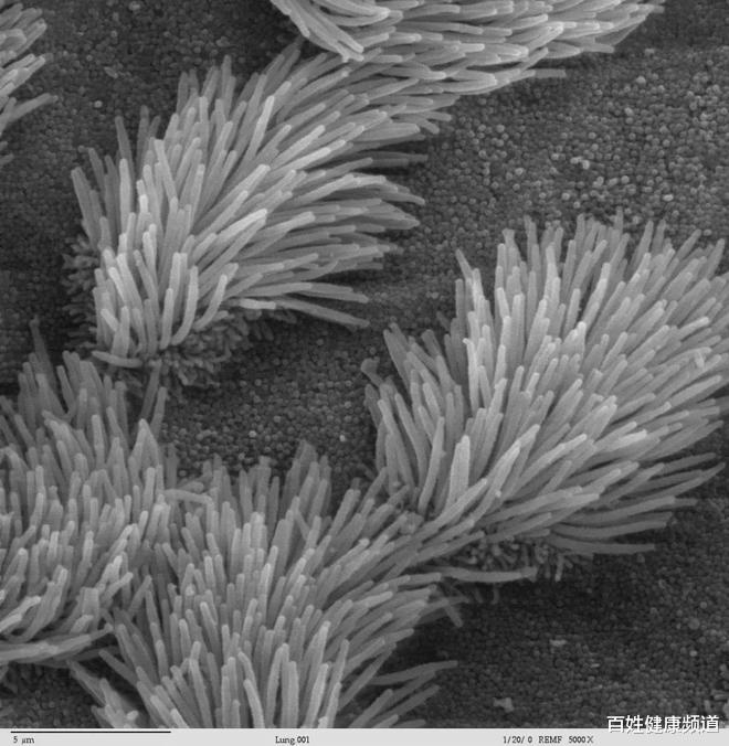 气管呼吸道黏膜表面运动纤毛的扫描电镜图像(图源:维基百科)