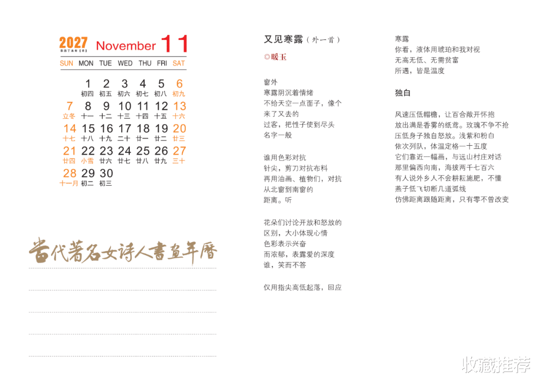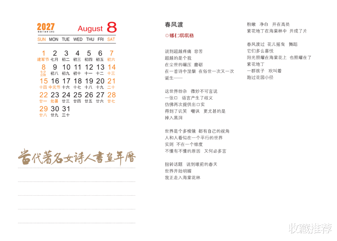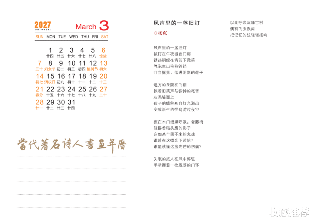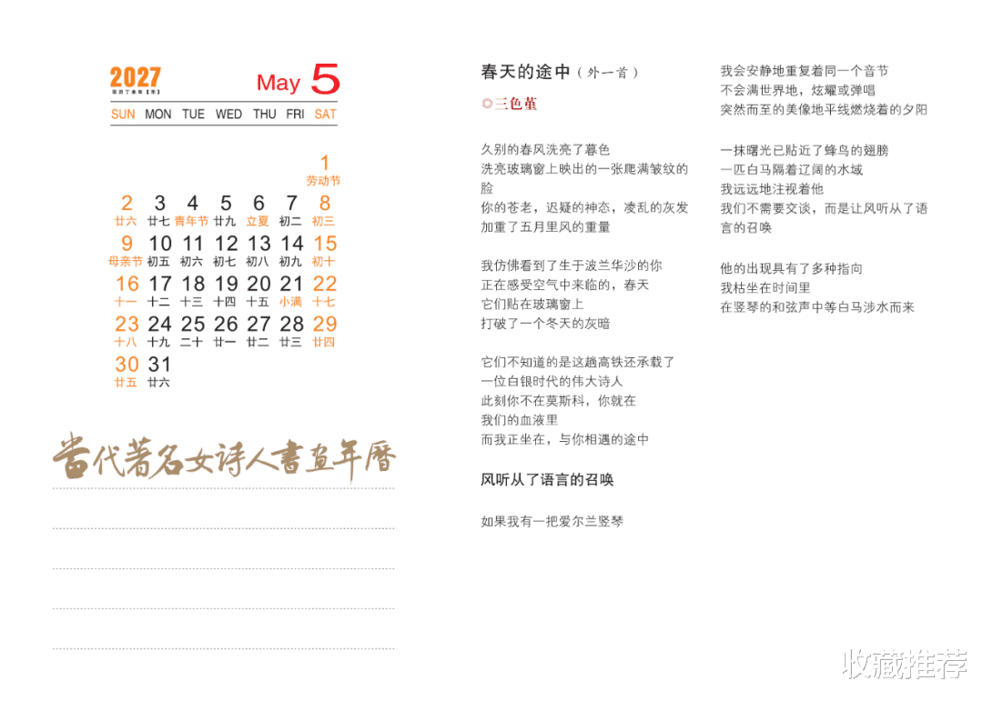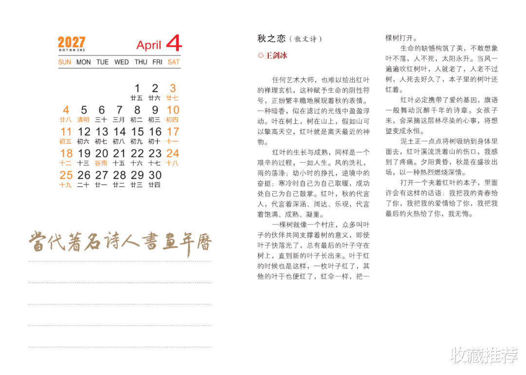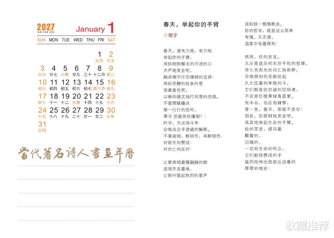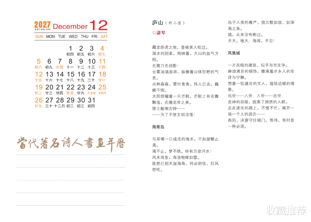 这本年历可谓独具匠心,让人在举首之间感受到诗书画的交融,墨香与色彩的共舞,精神与诗意的远游。方寸天地间,每一幅画皆可入诗,每一笔书法皆似琴音,每一行诗句均绽放出美的神韵。转眼一年飞逝,悲与喜,苦与乐,皆在这一点一线、一笔一划、一字一诗中徜徉。愿我们沉浸在书香画趣里,为诗意的生活增添一抹高雅的亮色。