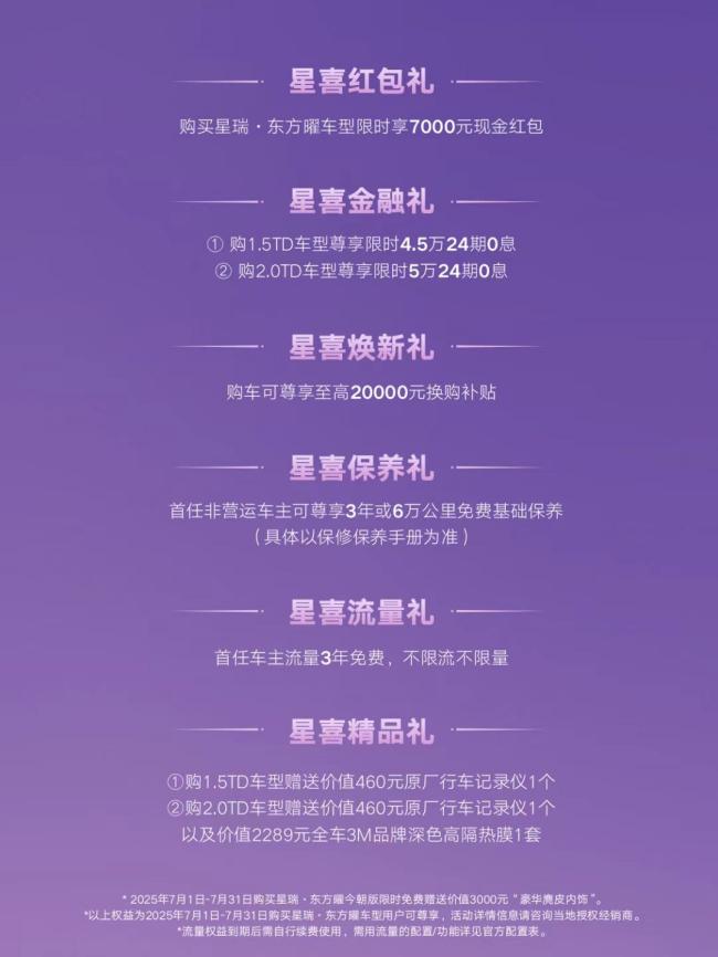 从购车成本看,星瑞的诚意足够实在。全系7000元现金红包直接抵扣车价,置换用户还能叠加至高20000元补贴(可与国补叠加),起售价下探至9.27万元;金融政策上,1.5TD车型支持4.5万24期0息,2.0TD车型则有5万24期0息,再加上首任车主3年不限量流量、3年或6万公里基础保养等福利,从购车到用车的全周期成本被精准覆盖。