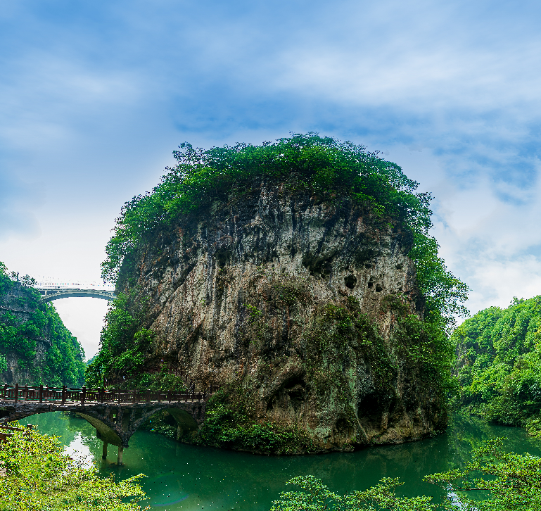 洒金谷的“福”,首先藏于山水之间。鱼梁江、诸梁江、沙河在此交汇,形成“三江斗奇”的壮阔景观。峡谷绝壁如削,瀑流如雷,其中“金龟戏瀑”最为奇绝——沙河飞瀑直下,岩间一石若龟首探水,时隐时现,宛如金龟戏水,寓意“灵动长寿”。明代葛镜桥横跨峡谷,以“豆腐桥”之名载入桥梁史,其石料方寸如豆腐,却历经四百年风雨不倒,被茅以升誉为“西南桥梁之冠”,暗合“积善成桥,福泽后世”的民意。